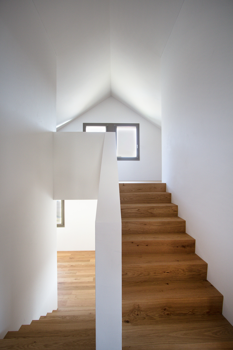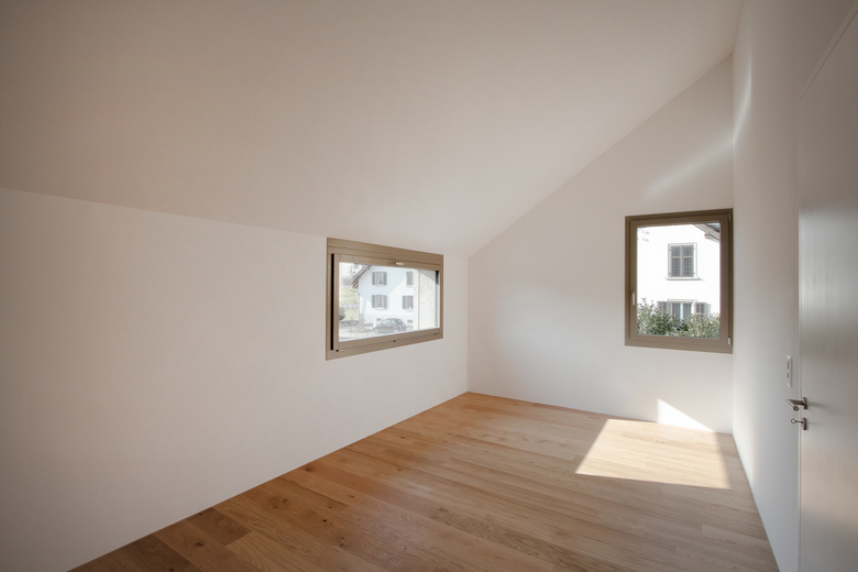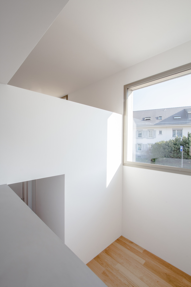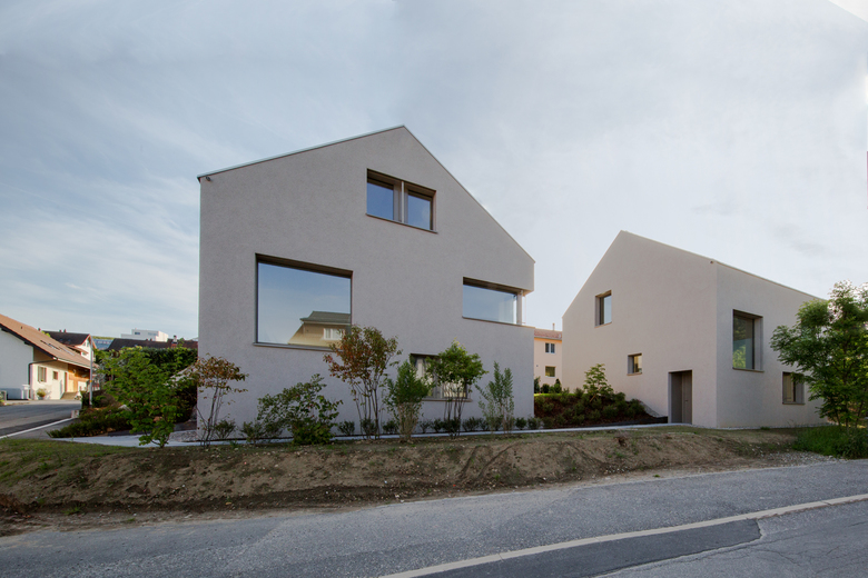 Die unterschiedlichen Fensterformate reagieren auf die Umgebung und das innere Raumkonzept. Es entstehen spannende Lichtverhältnisse und räumliche Bezüge zwischen innen und aussen. Der erhöhte und nach Südwesten ausgerichtete Gartenbereich mit gedeckter Terrasse befindet sich auf der Rückseite der Häuser. Die Häuser sind sandfarbig verputzt. Im Inneren betont das monolithische weiss die Raumkomposition mit einem durchgehenden Eichenparkett.