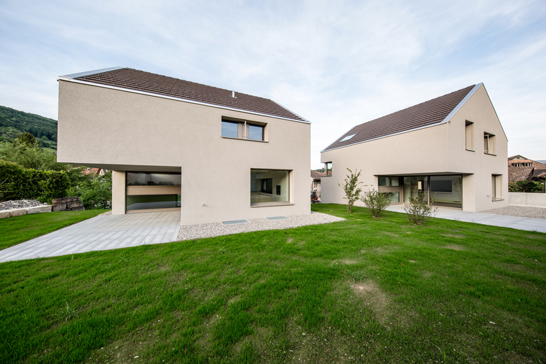Das Thema der dicht bebauten Saalhofstrasse in Erlinsbach wird in diesem Projekt weitergeführt. Zwei Häuser mit einer quadratischen Gebäudeform werden versetzt, jedoch nahe zueinander platziert. Beide Gebäude sind bis auf die Dachausrichtung und den Carport identisch strukturiert. Die Dachformen nehmen Bezug zu den umliegenden Bauten und den beiden Strassen auf, welche sie flankieren. Die dreigeschossigen Häuser sind mit Splittlevels um den jeweiligen Treppenkern im Zentrum angeordnet. Die versetzte Geschossanordnung schafft interessante Raumbezüge. Der Eingangsbereich ist zweigeschossig und die Räume im Obergeschoss sind überhöht. Alle öffentlichen Bereiche sind räumlich und visuell miteinander verbunden.
