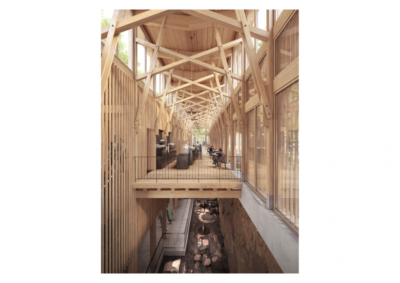 In Analogie einer überdachten Ausgrabungsstätte präsentiert sich der Ausstellungspavillon auf dem neu gestalteten Hopfenmarkt. Er überspannt den „Einschnitt“ in die Unterwelt, wo die Grundmauern Hamburgs erster Siedlung freigelegt werden und künftig zu besichtigen sind. Seine Ausrichtung orientiert sich am Verlauf der unterirdischen Wallanlage und weicht damit den „oberirdischen“ Richtungen des Hopfenmarktes und der Kirchenruine mit einem leichten Dreh aus. Gleichzeitig stellt der Pavillon eine Reminiszenz an die Markthallen des Hopfenmarktes dar, die lange Zeit an diesem Ort standen. Das minimalistische Raumprogramm aus Eingangsbereich mit Kasse und kleiner Cafébar sowie den zugehörigen Nebennutzungen ist in einer Halle aus Licht untergebracht, die in den Abendstunden wie eine Laterne diesen besonderen Ort erleuchtet. Zwei spiegelsymetrisch angeordnete Treppen führen den Besucher hinunter in die Ausstellung und geleitet ihn am Ende des Rundgangs wieder hinauf ins Foyer und zur neu gestalteten Parkanlage. Eine Pavillonarchitektur in Holzbauweise: eine typische Konstruktionsmethode temporärer Bauten, Holz ein traditioneller und archaischer Baustoff. Der Neubau spielt mit dem Faktor Zeit, möchte auf die Flüchtigkeit der Geschichte, auf die Überlagerung verschiedener historischer Schichten an diesem Ort verweisen und erlangt dadurch seine ganz eigene Identität als Pendant zur steinernen Ruine der Nikolaikirche.