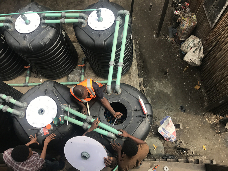 From 2013 to 2017, FABULOUS URBAN developed and implemented the Makoko Neighborhood Hotspot as part of the Makoko Urban Design Toolbox and the Makoko/Iwaya Waterfront Regeneration Plan. The Makoko Neighborhood Hotspot was designed as a technical and social infrastructure for one of Lagos' best-known urban slum settlement that is Makoko. It serves as an infrastructure hub providing urban services such as biogas linked community toilets and as a business incubator promoting waste-to-energy principles. Last but not least, its purpose is to serve at large as a community empowerment tool and learning center. The Hotspot represents more of a concept than a project even though the architectural design aspect was carefully and ambitiously developed. Its conceptualization and building phases confronted the poor underserved Makoko communities with a series of tough and difficult decision-making processes. After the completion of the structure and its inauguration in December 2015 the second project phase led in 2016 to the formation of the “Makoko Neighborhood Hotspot Multipurpose Cooperative Society Limited”, officially registered at the Lagos State Department of Cooperatives. It serves as the operational and administrative body of the Hotspot with its 20 members and a 7-strong management committee, compromising positions of the president, the secretary, and the treasurer, among others. One of the key tasks of the committee is the hiring, payment and supervision of employees. For this purpose, three business plans were drafted to ensure the sustainable set-up and long-term operation of the envisioned Hotspot activities. The implemented business activities – biogas-linked community toilets, biogas production, water treatment, and farming pipes – provide since December 2017, the end of the third project phase, the badly needed infrastructure for roughly 200 people. During the pilot phase, 10 families will receive cooking gas to be refilled at the Hotpot with specifically designed biogas rucksacks. As a business incubator, the Hotspot serves as pilot or prototype approach that could and should be replicated in other parts of the community and in other slum/ low-income settlements in Lagos State. One of the long-term goals of the Neighborhood Hotspot initiative is to inspire the government on how the dramatic lack of infrastructure in many communities and within large parts of the population could be approached, namely with the implemented decentralized strategic yet low-cost interventions.