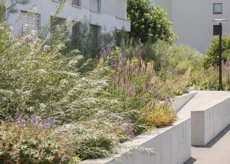 Malerische Staudeninseln mit abwechslungsreichen Blütenfarben und Blattstrukturen machen zudem den Wandel der Jahreszeiten erlebbar. Ergänzt mit passendem Aussenmobiliar, Spielgeräten aus Naturmaterialien und einem ausgeklügelten LED-Beleuchtungskonzept sind vielfältige Begegnungs-, Spiel- und Ruheplätze entstanden, die durch geschwungene Wege miteinander verbunden sind. Der naturnah gestaltete grüne Park wird so zum Lebens- und Entfaltungsraum für Gross und Klein, in dem die Nachbarschaft gepflegt und gelebt wird.
