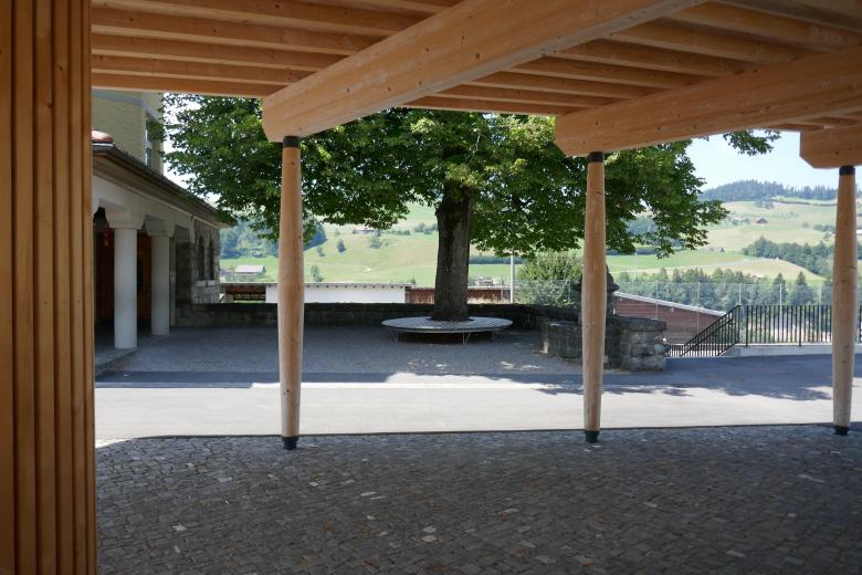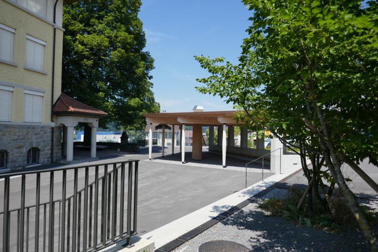 Im Zuge der Platzerweiterung erfährt auch der Aussenraum des Schulhauses Pfrundmatt eine Neugestaltung. So entsteht ein naturnahes Aussenschulzimmer sowie ein Pavillon der Schatten und Schutz vor Regen spendet.