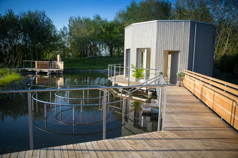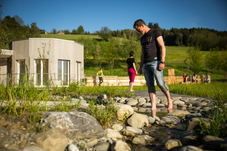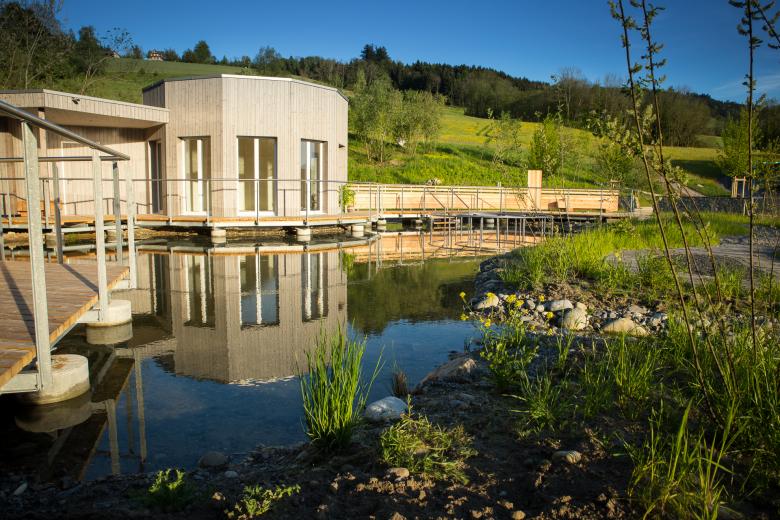 Ergänzt wird die Anlage durch einen Weiher und einen grosszügigen Holzpavillon, der für Seminare und kleine Feste zur Verfügung steht. Ein Panorama-Sitzplatz mit Aussicht auf den Pilatus und in die Alpen, eine nahe Grillstelle und ein Wasserspielbereich sorgen dafür, dass sich auch Familien rundum wohlfühlen.