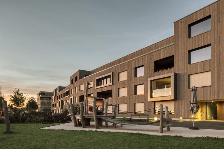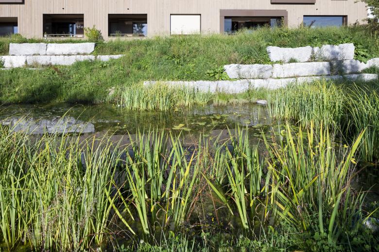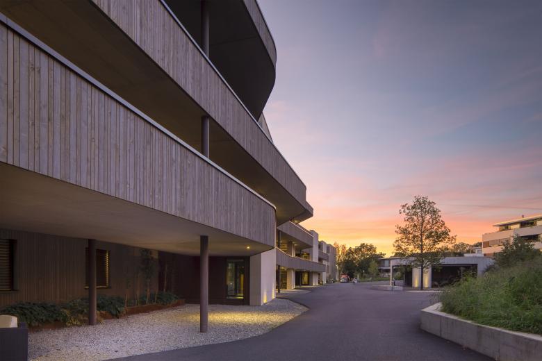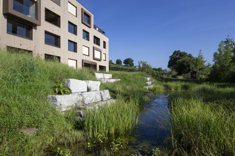 Die spannungsreiche, moderne Form des generationsdurchmischten Wohnens stellt hohe Ansprüche auch an die Umgebungsgestaltung. Insbesondere steht dabei das Zusammenwirken der Gemeinschaft und die Partizipation im Vordergrund. Im Mehrfamilienhaus «Im Dorf» stehen den Bewohnerinnen und Bewohnern aller Altersstufen dazu unterschiedlichste Plattformen und Möglichkeiten für gemeinsame Erlebnisse zur Verfügung. Zahlreiche natürliche Steinmäuerchen, ein naturnaher Teich, ein Pavillon mit Feuerstelle, Spielwiesen sowie verschiedene Sitzgelegenheiten sind über behindertengerechte und rollstuhlgängige Wege verbunden. Diverse Kletter- und Obstbäume, Sträucher und Pflanzen bieten in jeder Jahreszeit Abwechslung auch fürs Auge und lassen den natürlichen Gang der Zeit gemeinsam erfahren.