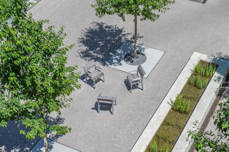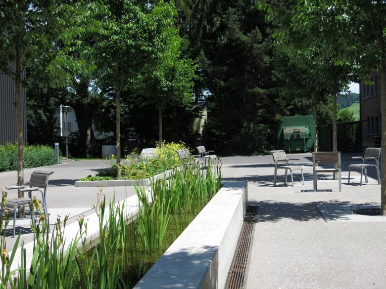 Fest installierte, einander zugewandte Sitzgelegenheiten laden zu Begegnungen aller Generationen und stärken das Gemeinschaftsgefühl. Zudem beleben und strukturieren ein lang gezogenes Wasserbecken mit Bepflanzung sowie bunte Stauden den Aussenraum.
