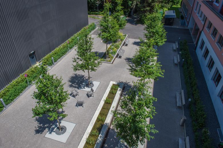 Inzwischen konnte den Bewohnenden und dem Personal durch eine neue Aussenraumgestaltung grosszügige Grünräume zurückgegeben werden. So schafft ein Baumdach aus Vogelkirschen einen attraktiven, beschatteten Aufenthaltsbereich mit weissem Blütenmeer im Frühling und kräftig leuchtendem Herbstlaub.