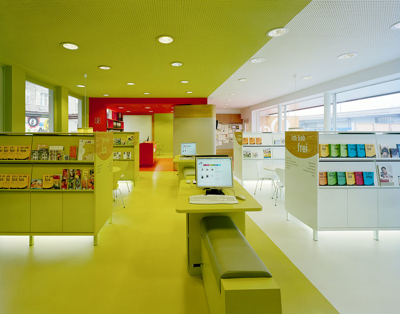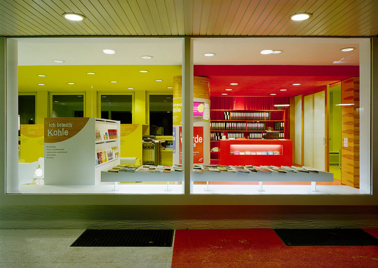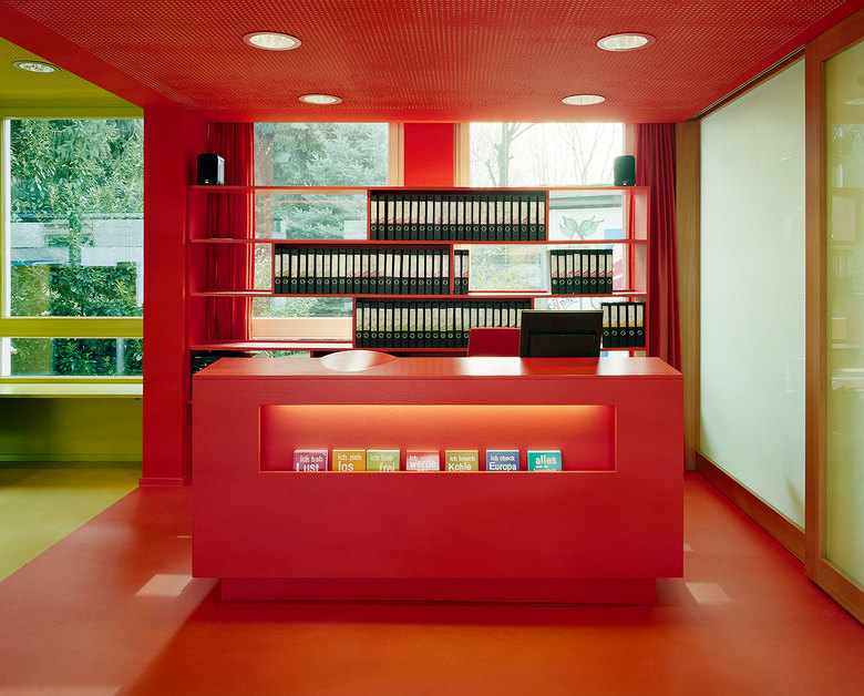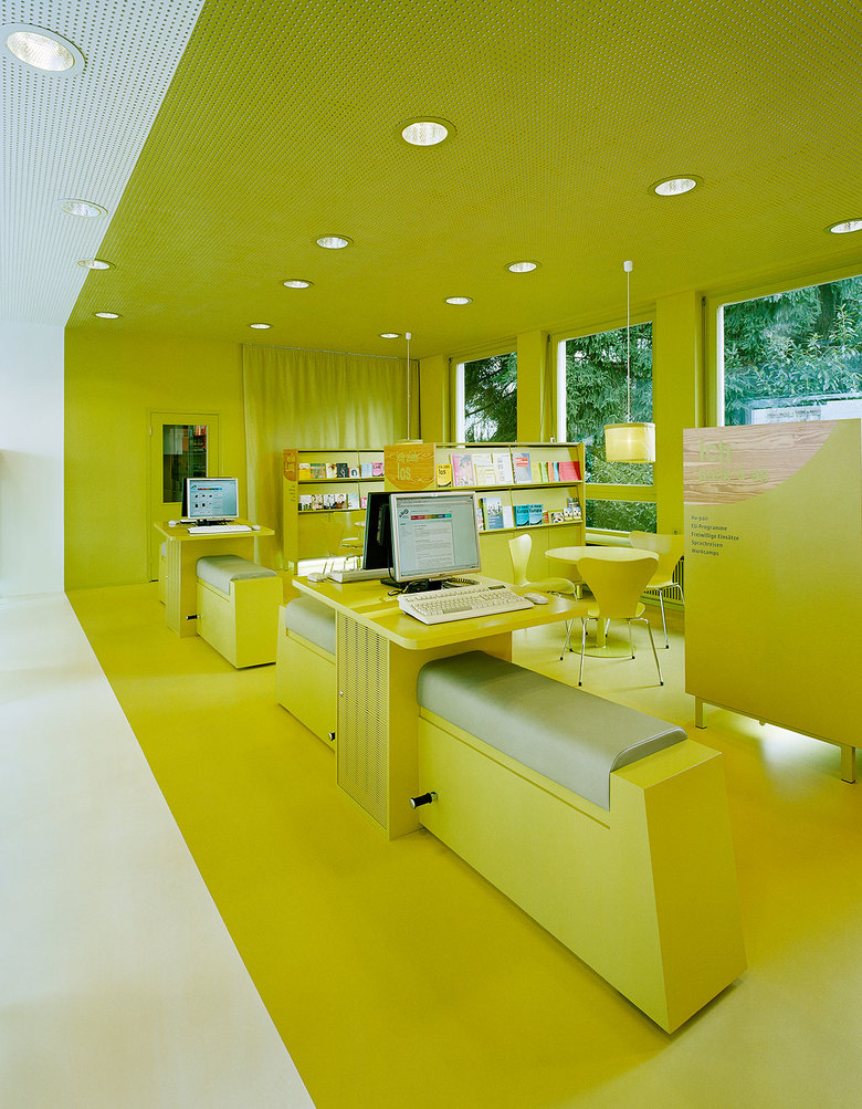 Drei räumliche Farbschleifen, die in einander verwoben sind, verleihen dem Raum eine positive, visuelle Grundstimmung und einen sanft stimulierenden farbigen Hintergrundklang. Es entstehen mehrere Raumbereiche mit unterschiedlichen Ausdrucksmöglichkeiten. Ein eisblauer und frischer Bereich am Fenster zur Straße, ein gelbgrüner, konzentrierter Bereich zur Gartenseite, der bis in den Beratungsbereich führt. Auf der orangeroten Schleife liegen Eingang und Theke als erste Anlaufstellen und aktive Informationspunkte. Der farbige Hintergrundklang schafft für die Vielfalt an Informationsmaterial einen kräftigen, aber ruhigen Hintergrund. Die Assoziation der Einzelmöbel mit Mobilitäts-Motiven schafft eine räumliche Dramaturgie von Aufbruch und Veränderung.