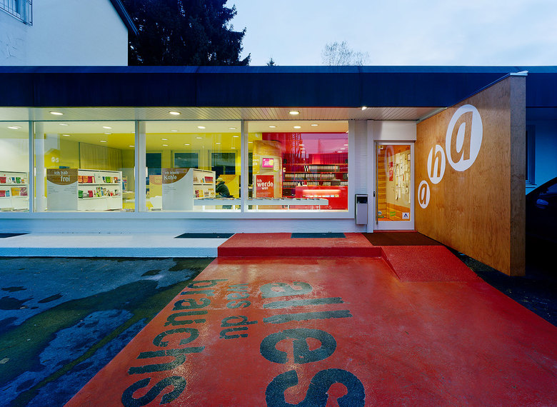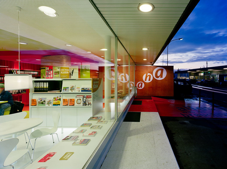 Die Außenwirkung und die Markierung des Eingangs gelingen durch eine auskragende Wandscheibe als Kundenstopper und Logoträger. Die Fortsetzung der roten Schleife trägt die Farbigkeit hinaus auf den Vorplatz und holt dort als roter Teppich die BesucherInnen ab.