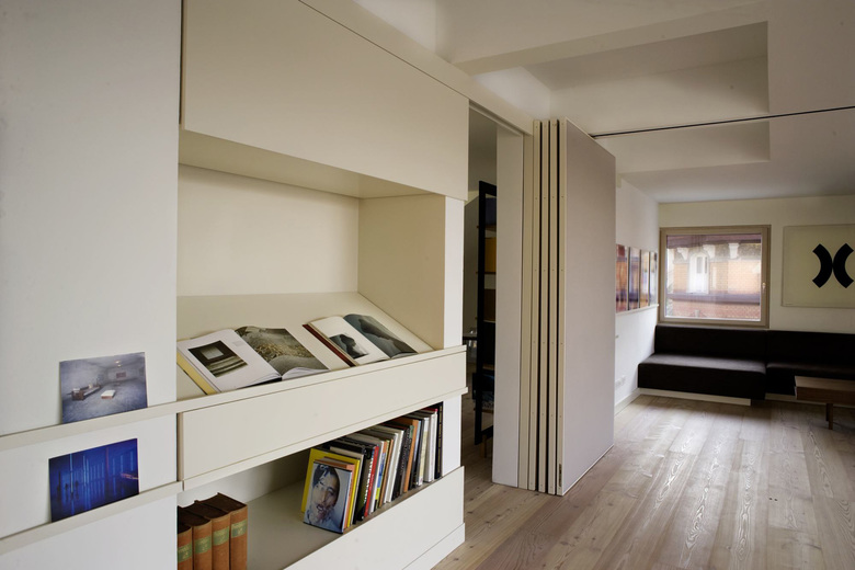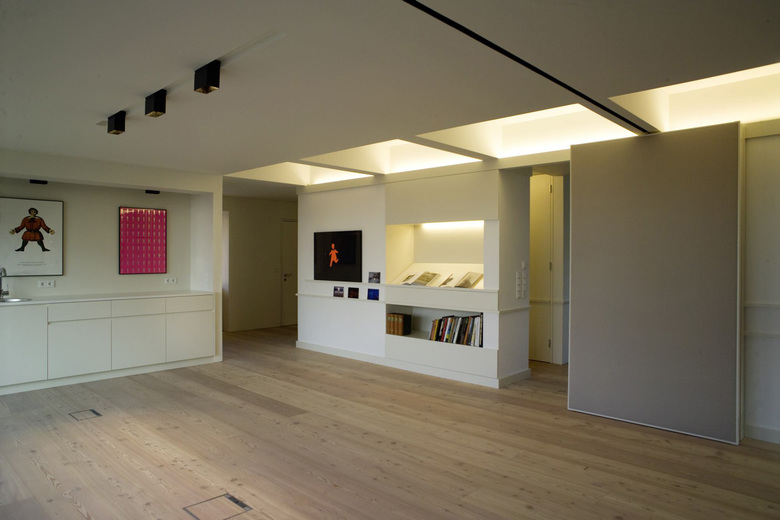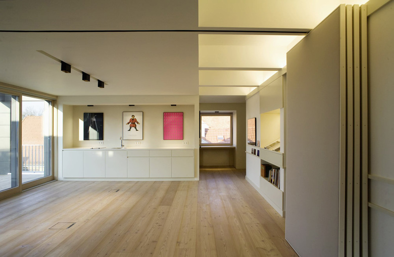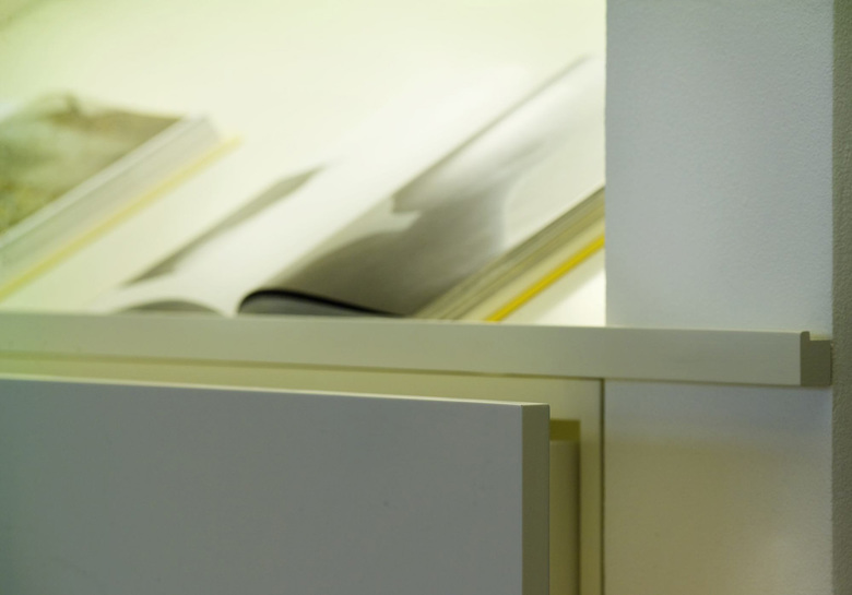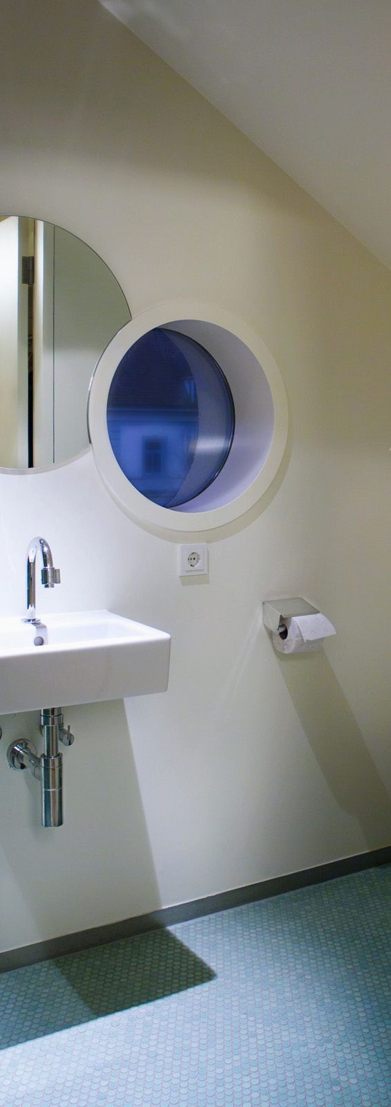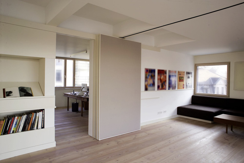 Ein großer Arbeits- und Besprechungsraum dominiert. Daneben sind ein Arbeitsplatz für das Sekretariat, ein abgeschlossenes Büro und ein Archivraum vorhanden. Der Hauptraum ist mit einer diskreten Küchenzeile ausgestattet und endet an der Stirnseite mit einem breiten, raumgreifenden Sofa, das für entspannte Gespräche, für Musestunden dient. Langfristig kann das Büro ohne große Eingriffe in eine Wohnung umgerüstet werden.. Ein breiter Lärchenholzboden bildet die – atmosphärisch – solide Grundlage. Die zentrale Trennwand ist als allseitig nutzbarer Körper frei eingestellt. Im Besprechungsraum bezeichnet eine Folge von Deckenkassetten die Wegzone und verschafft dem Raum mit 2,50m Höhe mehr Luft nach oben. Das Beleuchtungskonzept unterstützt die Wahrnehmbarkeit des großen Gesamtraumes und ermöglicht eine Justierung der Lichtstimmungen. Ambivalenzen und Potentiale sind wichtige Komponenten für den kreativen Arbeitsprozess. Diese Sensibilität für Nuancen provoziert der Raum durch eine besondere Farbgebung, die mit fünf verschiedenen Schattierungen von Weiß arbeitet. Je nach Witterung und Aufmerksamkeit verändert der Raum seinen Charakter und reagiert so auf Tag, Zeit und Stimmung.