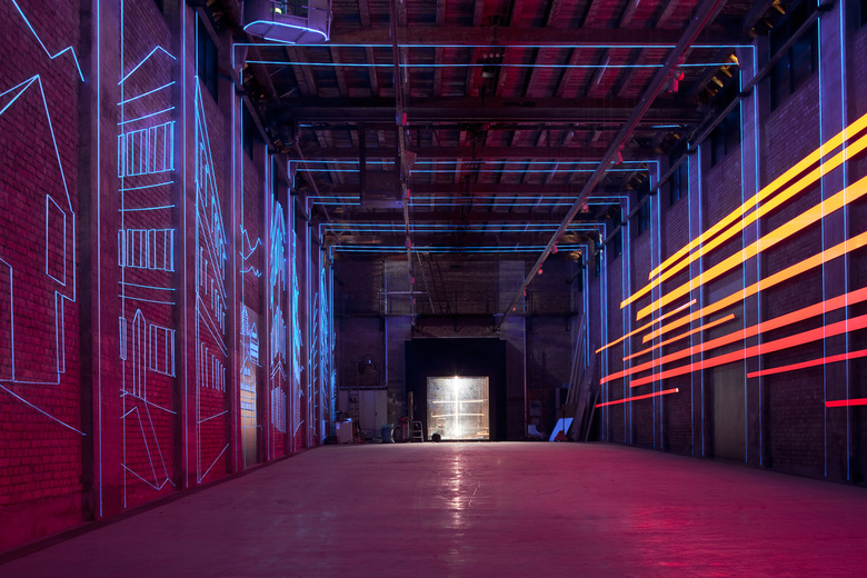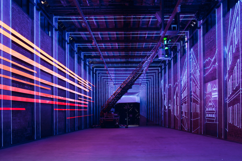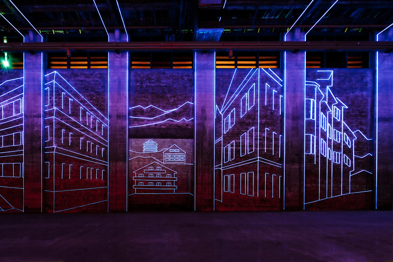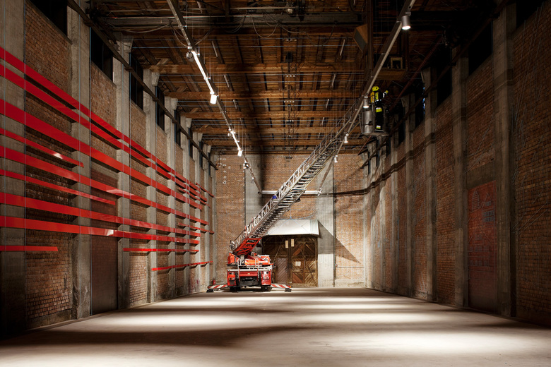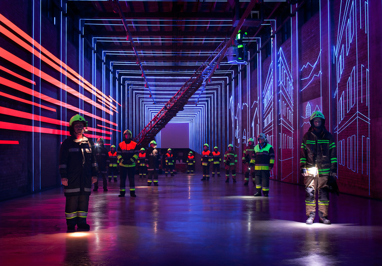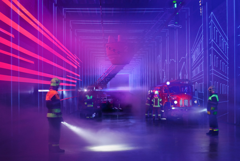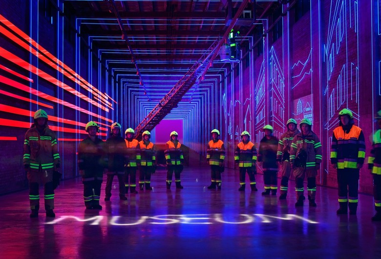Man betritt die wuchtige Beton- und Ziegelkonstruktion aus dem 19. Jhdt. über ein Schiebetor an der Stirnseite. Eine Auswahl von 16 historischen Feuerwehrfahrzeugen aus den Beständen des Landesfeuerwehrmuseums sind im rasenden Stillstand in einer Licht- und Klanginstallation zu sehen. Die nächtliche Inszenierung zeigt die Fahrzeuge in voller Ausstattung auf der Fahrt zu einem imaginären Einsatzort. Hintergrund bildet ein Linienwerk aus lumineszierenden Schnüren, das Vorarlberger Haus- und Naturlandschaften zeichnet. Großgeräte und Rettungsutensilien der Feuerwehr schweben zur Illustration des dramatischen Einsatzmoments in diesem einzigartigen Innenraum und bieten viel Stoff zum Staunen und Bewundern.
