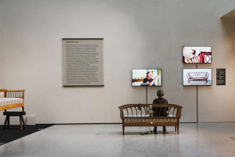 Die Ausstellungsidee entstand schon vor vielen Jahren, als Johannes Mohr uns von seinen vielen restaurierten Kanapees aus dem Bregenzerwald erzählte, die alle zwischen 1820 und 1840 datiert waren. Das vorarlberg museum ließ sich für das Thema der Biedermeiersofas begeistern und zeigte die, wie von allen Seiten zu hören war, gelungene Ausstellung im Atrium, einem frei zugänglichen Bereich im Erdgeschoss des Museums.
