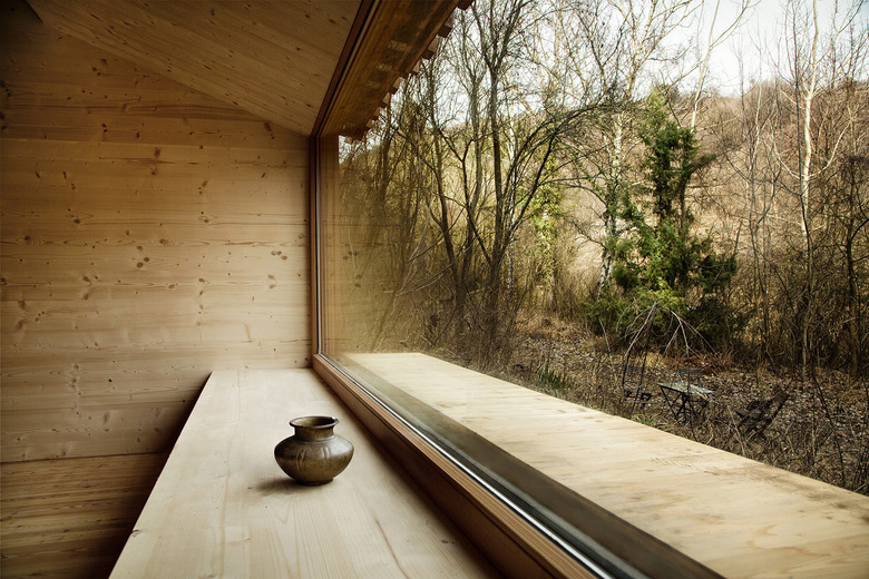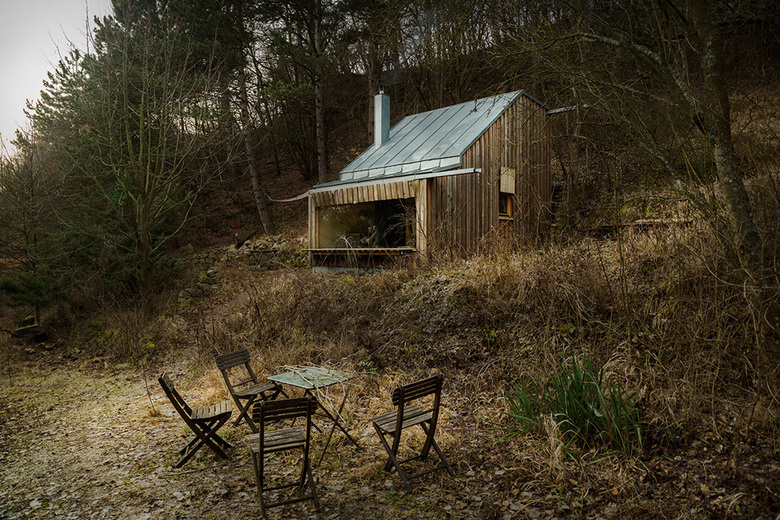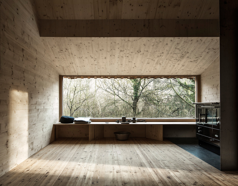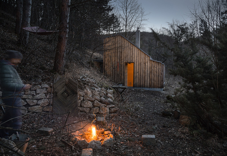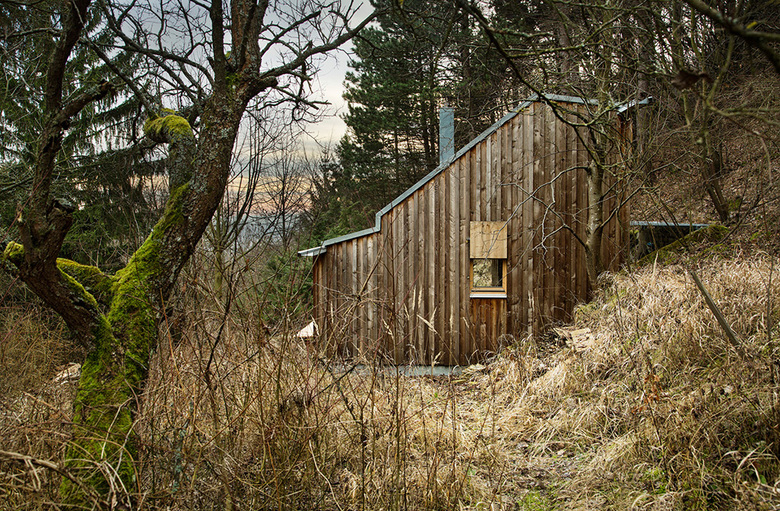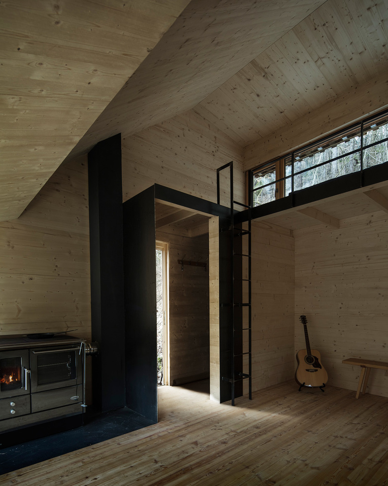 Dieses schlichte Haus nimmt starken Bezug auf seine Umgebung, folgt der Kontur eines verfallenden Vorgängerbaus und wurde regelrecht um einen Menschen und seine Leidenschaften herum gezeichnet. Eine kantige Raumform umschließt auf zwei Niveaus das Leben in diesem Rückzugsort. Ganz verschlossen mit allseitigen Läden läßt sich die Hütte zu unterschiedlichen Ausblicken öffnen. Vorgefertigt aus Holz findet sich alles Notwendige auf engstem Raum. Eine markante bauliche Identität wird zum Partner, zum Ort des Rückzugs, aber auch der Gastlichkeit und der persönlichen Weiterentwicklung. Ankommen, Schutz suchen, ausruhen, sich nähren und Gleichklang finden. Dann der Blick hinaus. Vision.