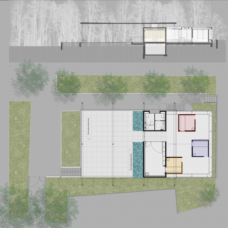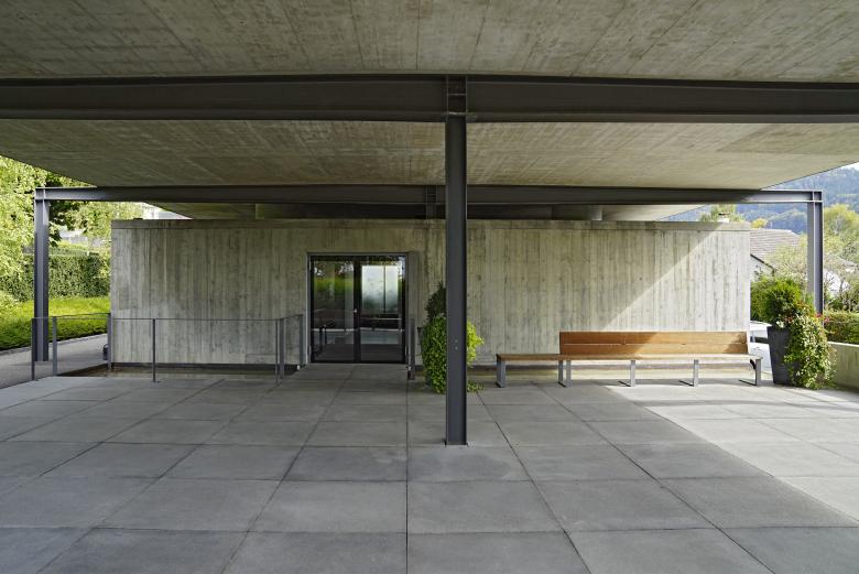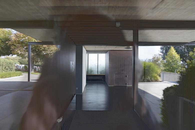 Eine Brücke über einen Wasserlauf führt den Besucher vom Vorplatz zum gedämpften Licht des Innenbereichs. Die Verstorbenen sind in frei im Raum stehenden Kuben aufgebahrt, unter einem Zenitallicht. Die Begegnung mit dem Tod ist immer eine Begegnung mit der Leere, die wir weder ästhetisieren, noch monumentalisieren wollten. Jedoch suchten wir nach einer unverkennbaren Raumstimmung für diesen Ort, nach einer innigen, zeitentrückten, aber hellen und klaren Stimmung, in der man auch sich selbst neu begegnen kann, und trotz des Abgeschottet-Seins vom Alltag mitten im Licht des Lebens steht.
