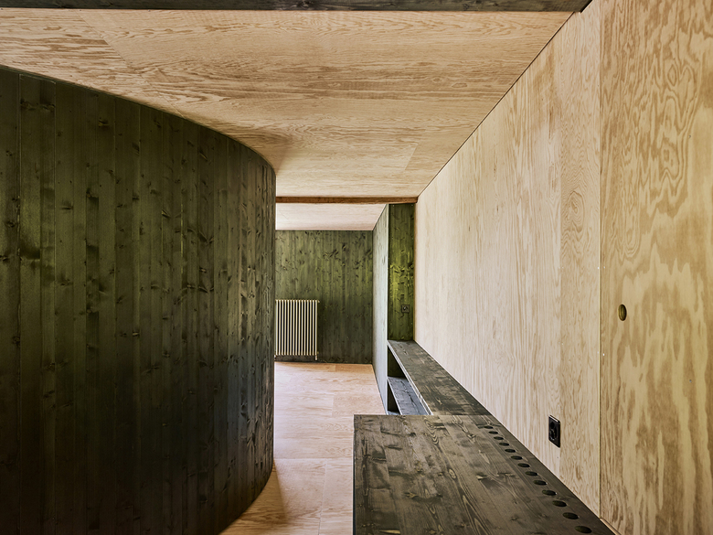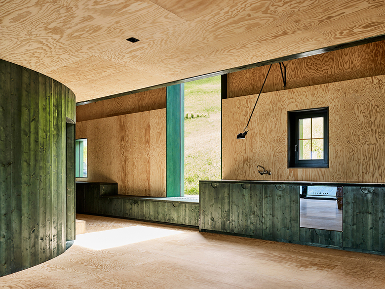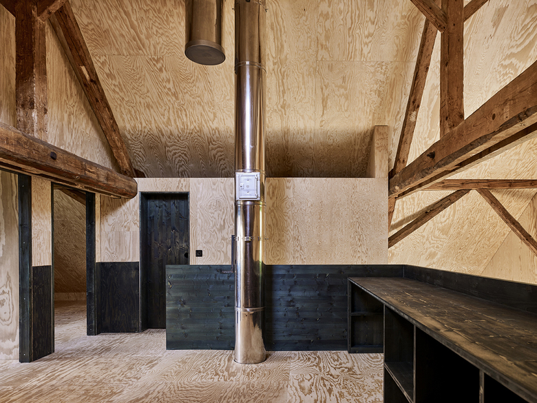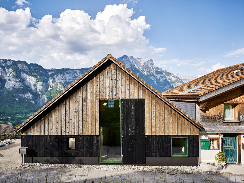 Die alten Ställe hatten Dachstühle, die grosse Räume überspannen konnten. Dieser Umstand wird genutzt und sämtliche nichttragenden Wände werden entfernt, um im Erdgeschoss einen grossen Raum zu schaffen, nur zoniert durch einen leichten, hölzernen runden Kern. Dieser Kern schafft einen fliessenden Bewegungsraum und bildet rundherum Orte heraus zum Kochen, Arbeiten, Wohnen und Spielen. Das Haus wird zum See hin geöffnet: In der Nordost- und in der Nordwestfassade wird ein Fensterkasten mit raumhohen Verglasungen aussen vor die alte Tragstruktur aufgesetzt, der den Blick in die Ferne öffnet. Das ursprüngliche Eingangstor zur Strasse wird als grosses hohes Fenster wieder reaktiviert, um einerseits zum Hang hin den Blick hinauf zum Berg zu ermöglichen und gleichzeitig die Mittagssonne ins Haus zu holen.