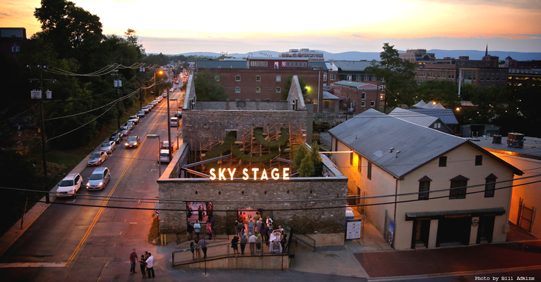 Sky Stage, a transformative building-scale public artwork, opens in the shell of a burned and boarded building.