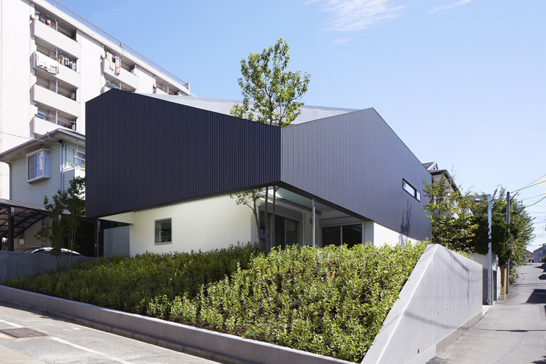 A residence in Tokyo designed by Yo Yamagata Architects is cut off at the corner for a terrace, a tree, and a triangular view of the sky.