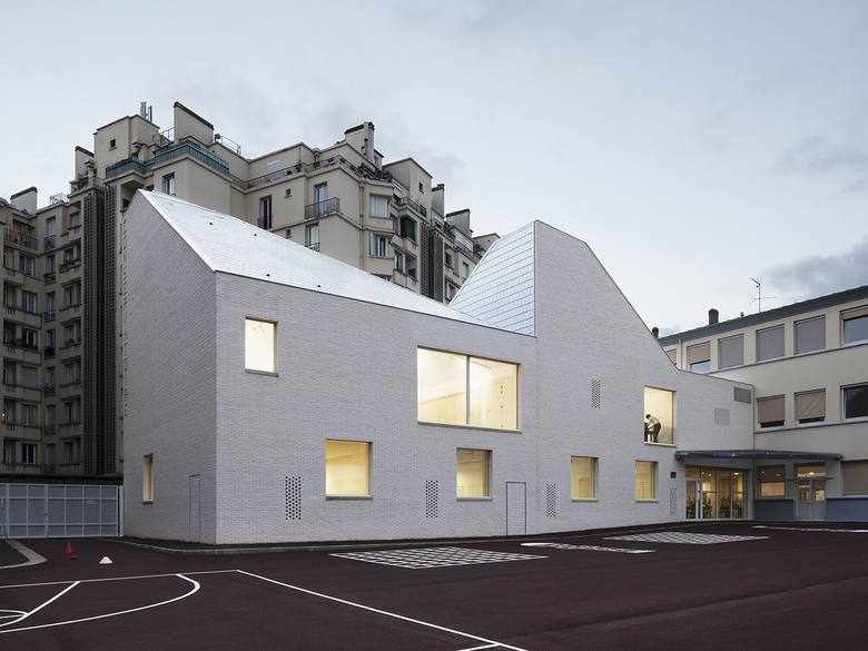 The project is located at the heart of a city block in a school playground. The new volume extends an existing school building up the slope of the passageway that leads onto the site, and settles itself onto the playground’s sloping surface.