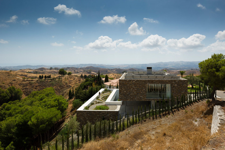 The house is organized within one meandering form made of natural stone, creating three volumes with an open space interwoven between them.
