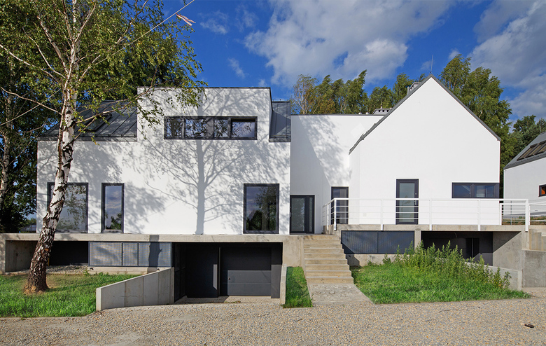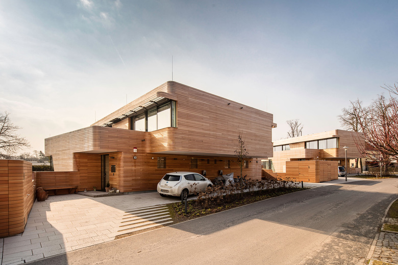 GRAFT has designed a single-family house and two semi-detached houses, all of them environmentally friendly buildings that join mobility, energy and health.