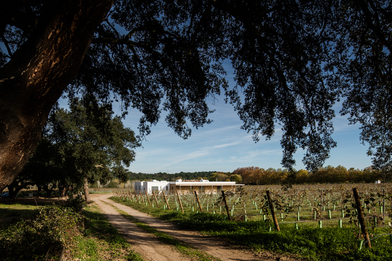 Implanted on a large agricultural estate, the house is built in the middle of the property’s vineyard on an almost flat terrain adjacent to a cork oak forest.