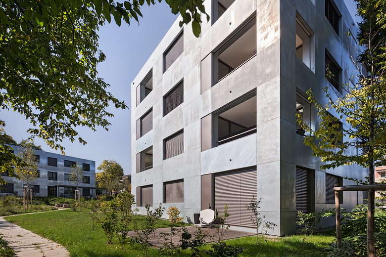 The residential development at Chilestieg in Rümlang, Switzerland looks like a set of shimmering crystals embedded in lush green surroundings.