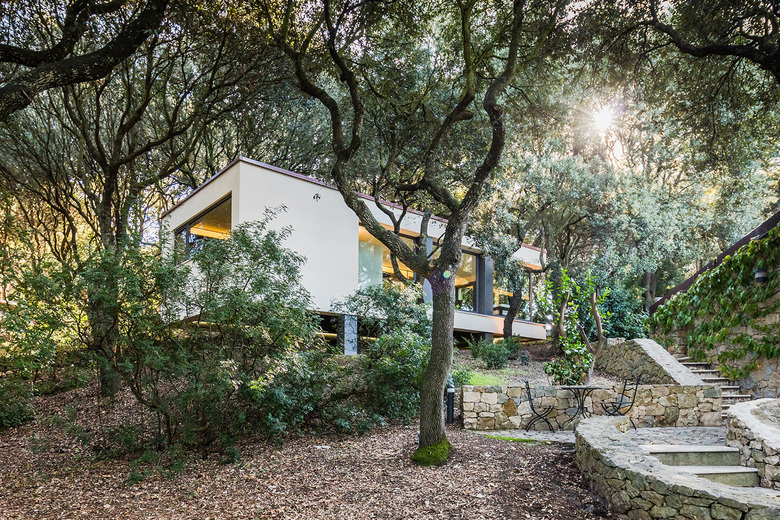 The House in the Woods project site was an interesting challenge for the working team Officina29 Architetti, where the strong, powerful presence of oak trees and the sloping terrain imposed the design that blurs the boundary between building and land