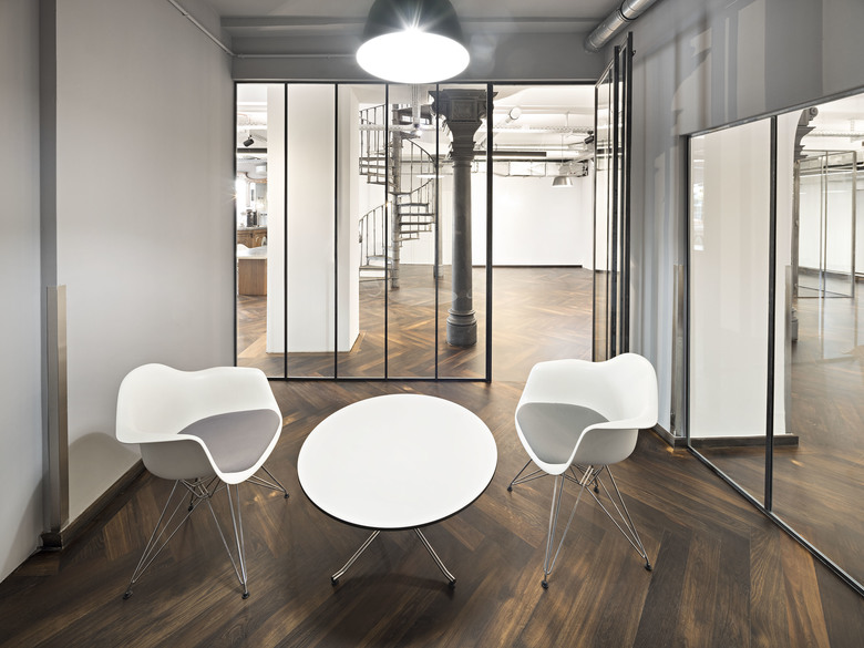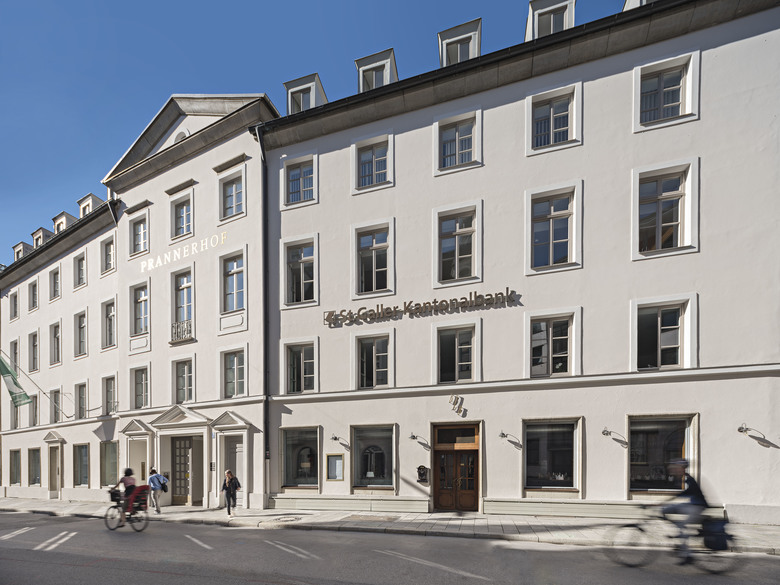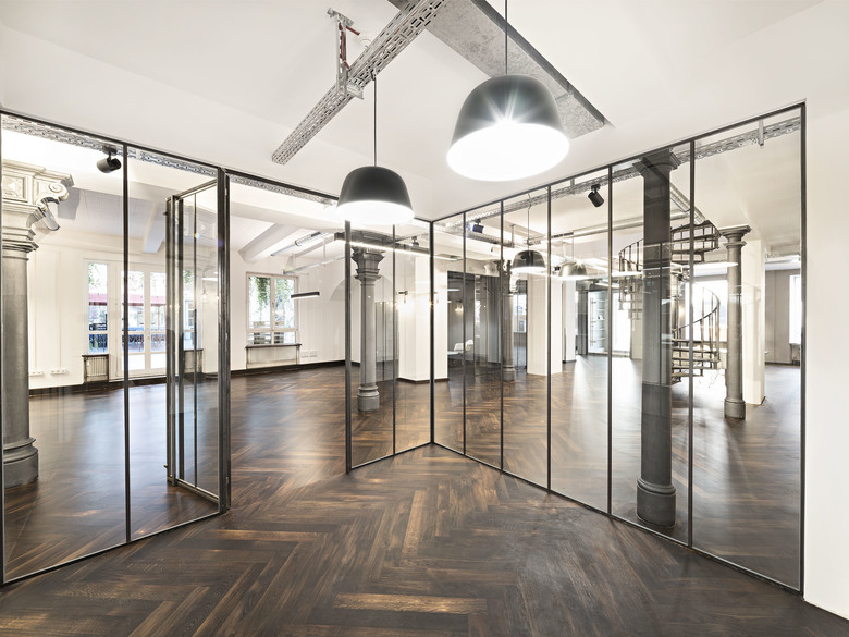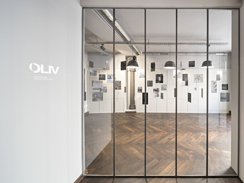 Sanierung und Revitalisierung Prannerstraße 11. Das 1947 wiederaufgebaute Gebäude – Teil des Münchner Altstadtensembles – erfährt eine umfängliche Sanierung mit Erneuerung der Haustechnik. Im Erdgeschoss und im ersten Obergeschoss gestaltet Oliv Architekten repräsentative Büroflächen. Die ehemaligen Räume einer Bank verwandeln sich in ein Architekturbüro. Stilprägende Materialien sind dunkles Holz, roher Stahl und Glas. Die bauzeitlichen Eisensäulen werden durch die Freilegung der Decke in Szene gesetzt.