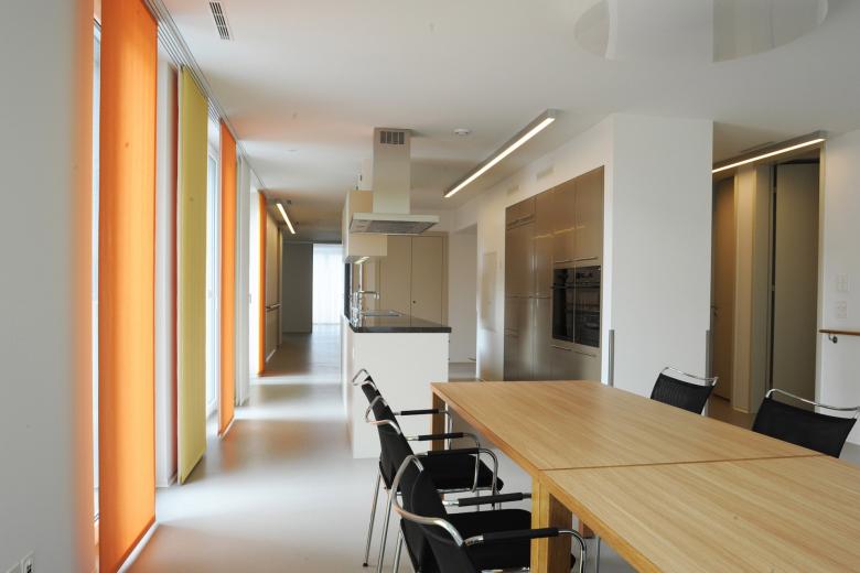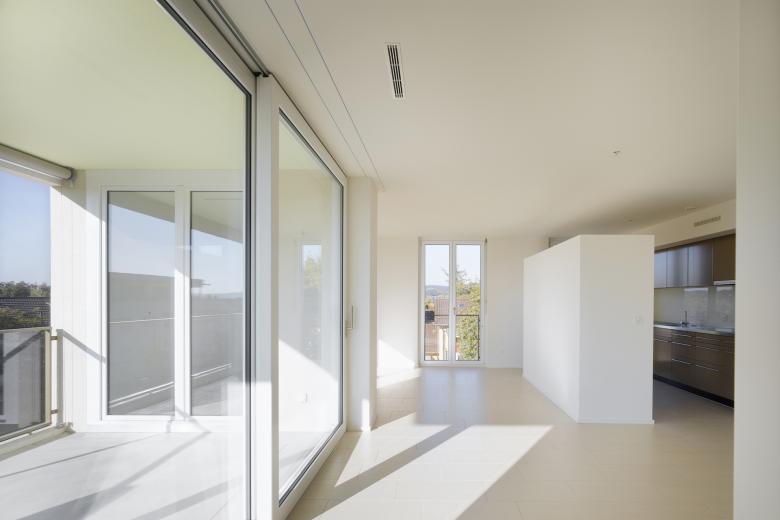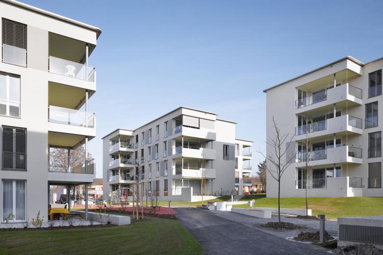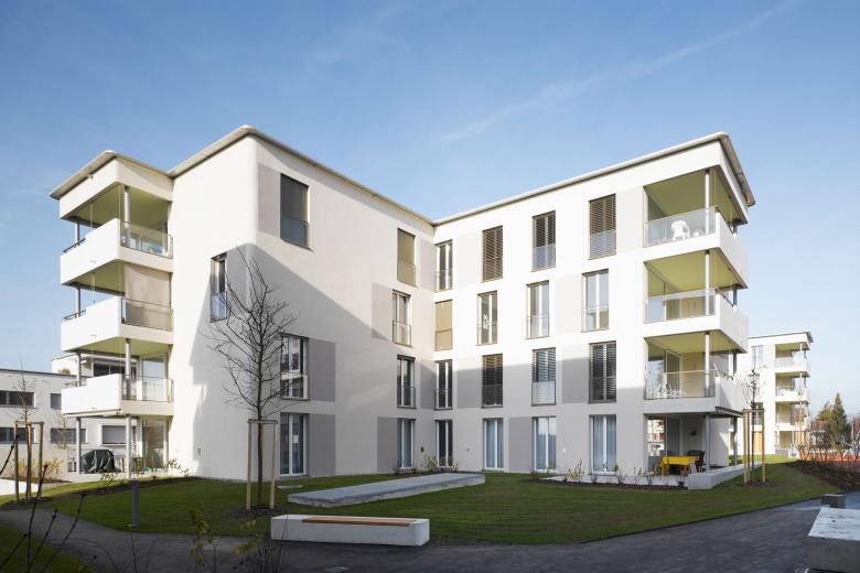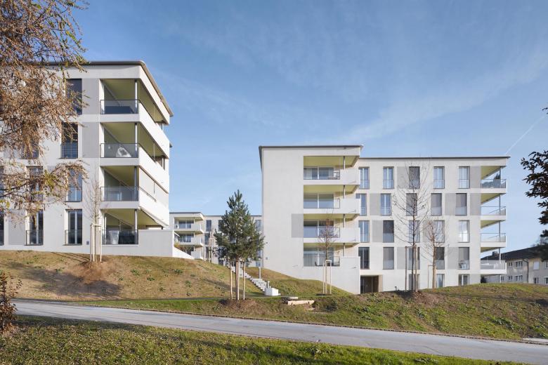 Im Rahmen einer langfristigen Erneuerungsstrategie der Baugenossenschaft für drei Siedlungsetappen werden die ersten zwei Etappen A + B realisiert. Die Wohnsiedlung der Bauetappe B liegt weitgehend lärmgeschützt und bildet mit ihrer lockeren, gestaffelten Anordnung von fünf gleichartigen Baukörpern einen parkähnlichen Aussenraum. Die dreiflügligen Baukörper greifen in den Grünraum und weisen zwei unterschiedliche Wohnungstypen auf. Gegen Osten und Süden sind die grösseren Familienwohnungen mit 4.5 - Zimmern angeordnet, nach Westen orientiert sich die kleinere 3.5 - Zimmer - Wohnung. Die Nebenraumzone mit Nasszellenkern und Individualzimmern wird kompakt angeordnet und spielt einen grosszügigen, offen konzipierten Wohn- Essbereich frei. Die umlaufende Anordnung von französischen Fenstern und ausladenden Terrassen an den Ecken der Baukörper verzahnen die Wohnräume mit der Umgebung und ermöglichen vielfältige Aus- und Durchblicke. Die Erschliessung zu Fuss erfolgt über den gemeinschaftlich nutzbaren Park. Über eine unterirdische Tiefgarage sind die Gebäude miteinander verbunden und für den motorisierten Individualverkehr erschlossen. In einem Haus wird im Erdgeschoss eine Pflegewohnung der Stadt Kloten realisiert.