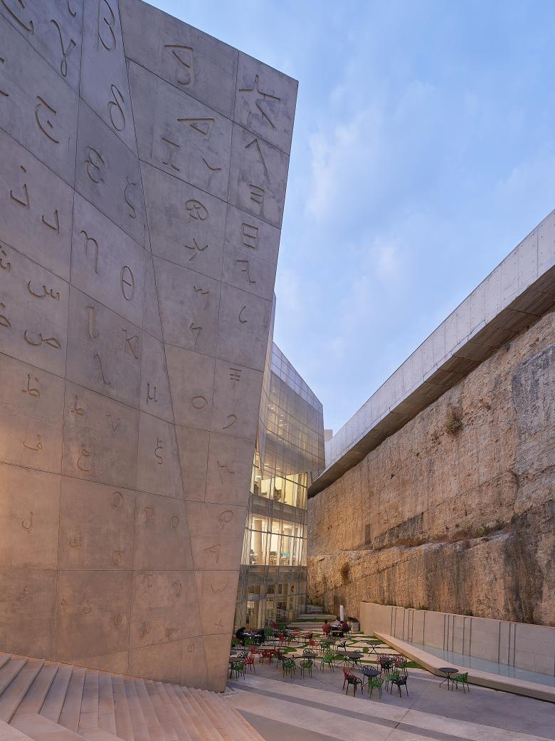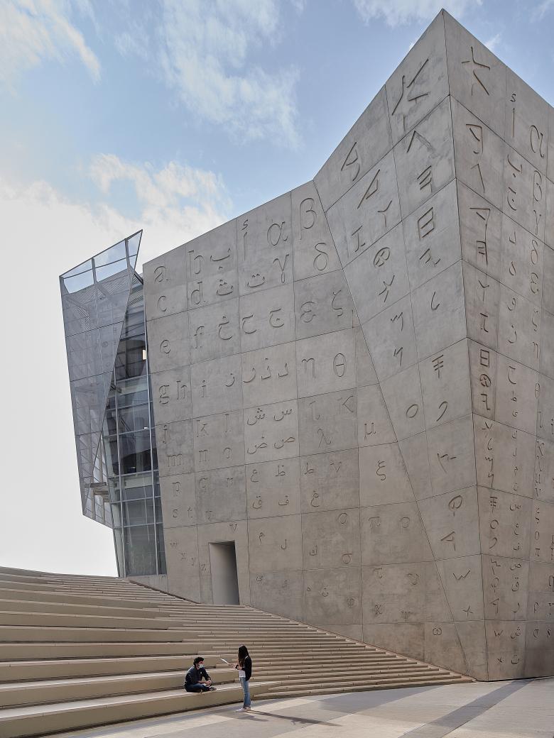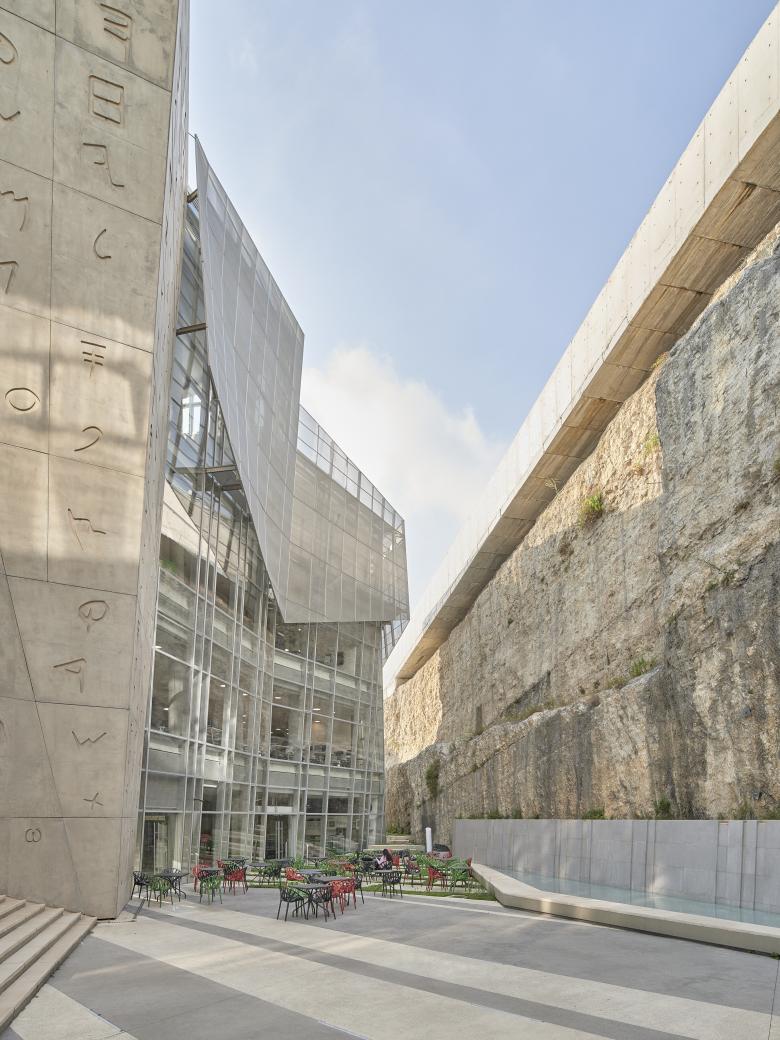 Throughout the project, the contrast between solid and transparent is apparent. During the day, the building facades are opaque and become more transparent in the evening. Above the amphitheater, a concrete wall displays the carvings of the four alphabets historically used throughout the immediate region.