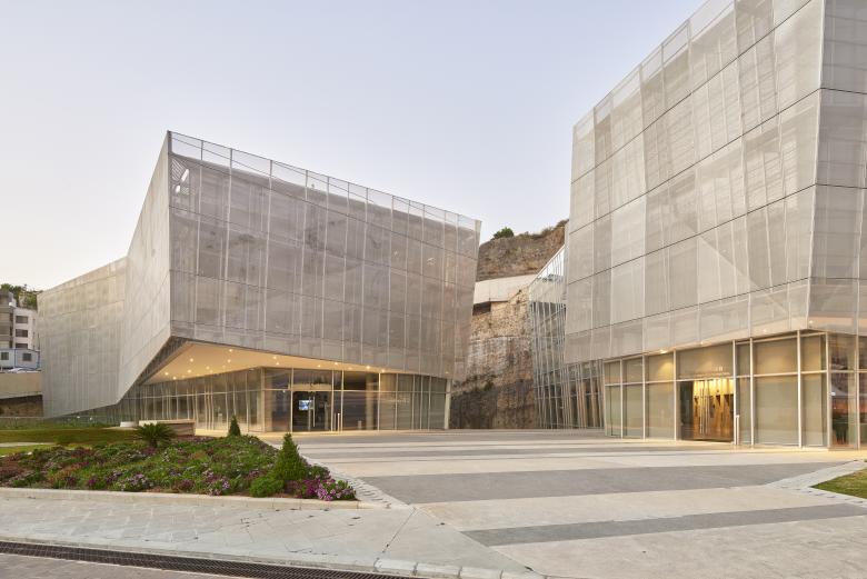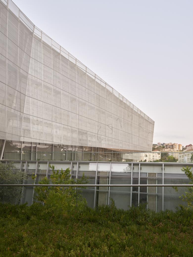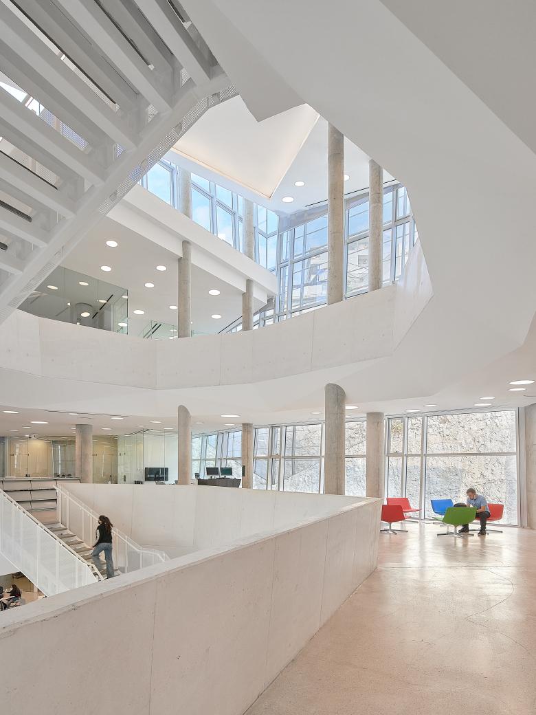 Passive features inspired by the local typology are incorporated into the design: the double outer skin allows for shading, ventilation, and light diffusion, and the main open atrium acts like a chimney vent; detaching the buildings from the rock allows the sea breeze to circulate and ventilate the outdoor amphitheater and café areas.