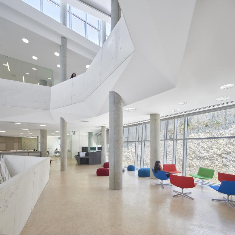 The Lebanese American University commissioned Atelier Pagnamenta Torriani to design a new library and central administration building on its Byblos Campus. The excavated rock and mountain above were the first impressions while visiting the Byblos Campus site. The exposed sedimentary rock and the complex, stratified history of the region became the inspiration for our design. Both the library and the administration buildings are placed adjacent to the excavated rock, forming an open amphitheater with the rock as a backdrop, juxtaposing the natural with the man-made.