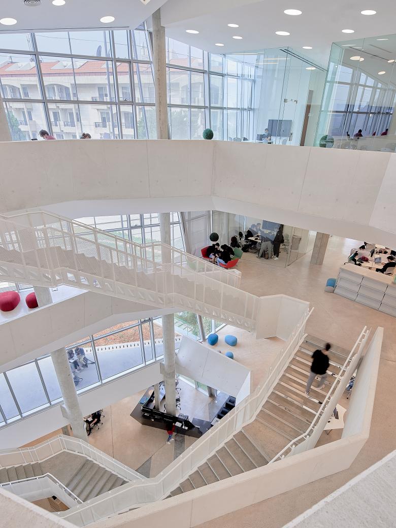 The new structures are conceived as dynamic forms and their exterior skins are layered, providing shade and optimizing diffused light inside according to the orientation. The interior spaces of the library are developed around a large atrium that acts like a hub, brings great luminosity, and allows for natural air circulation. In our design, the exterior spaces flow seamlessly inside, creating connectivity between the two. The interior spaces are fluid, open, and transparent.
