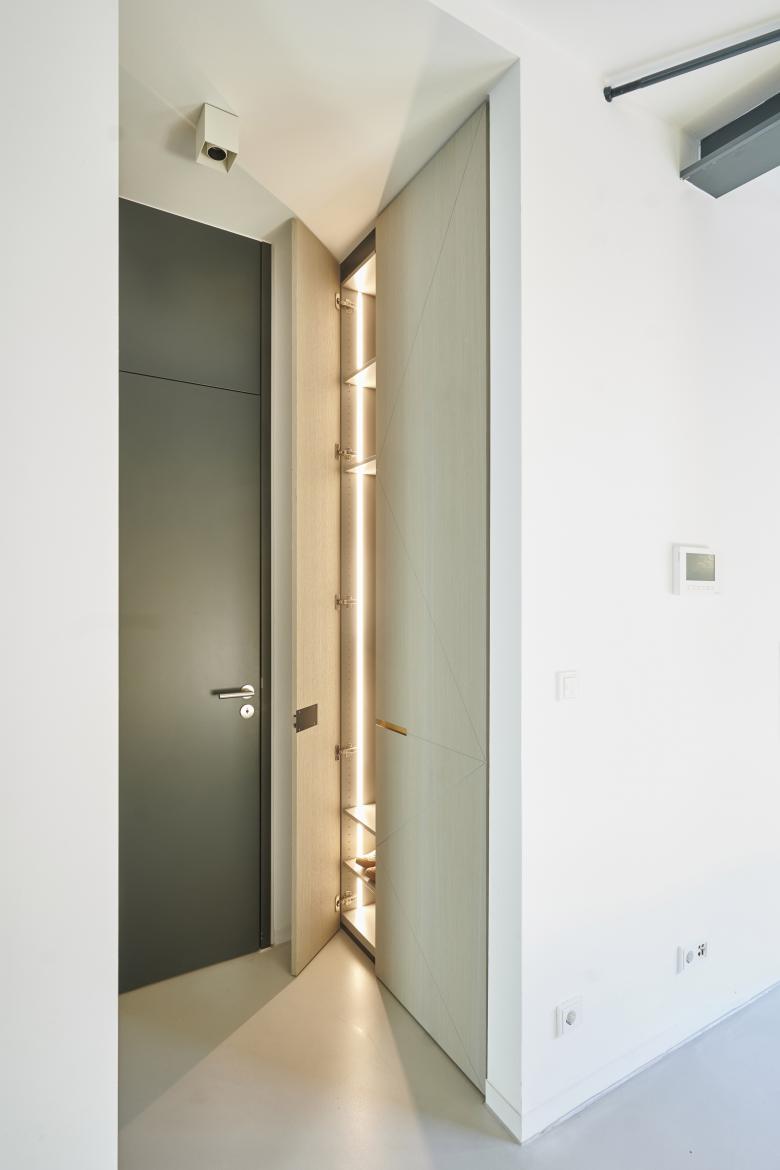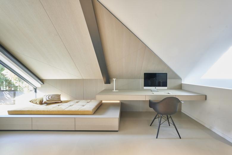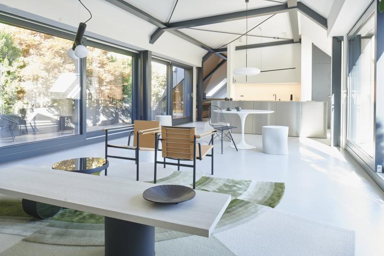 Die detaillierte Farb- und Materialauswahl, die Integration von Objekten sowie der minimalistische Stil, der den Innenarchitekten auszeichnet, haben dieses Industrial Loft im Zentrum der Stuttgarter City zu einer wahren Oase gemacht. Es war ein langer Prozess, in dem maßgefertige Möbel wie „Rueda Table“ oder „Frontera Rug“ entwickelt und andere wie die Schaukel „Luna Chair“ integriert wurden, alle genannten Produkte sind Teil der Kollektion von Möbeln und Accessoires der Designerin Milena Romero.