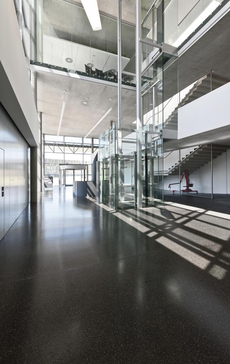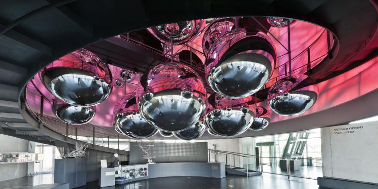 Den „Kern“ der Ausstellung bildet ein riesiger Tiegel, der frei im Raum hängt und in Form und Dimension den echten Schmelztiegeln nachempfunden ist. Sogenannte „Tiegelfeste“, die bereits während der Errichtung abgehalten wurden, würdigen die beeindruckende Wucht dieses Elementes. Darin befindet sich auf verschiedenen Ebenen (= frei im Raum hängende Kugeln) die Ausstellung, die durch Stege miteinander verbunden sind. Über eine Brücke, die das Atrium überspannt wird die Ausstellung aufgeschlossen. Im abgesenkten Eingangsgeschoss und im Erdgeschoss liegen Foyer und Vortragssaal, während sich die „Stationen“ der Ausstellung im vertikalen Teil befinden. Vom Restaurant im obersten Geschoss aus bietet sich ein ausgezeichneter Panoramaausblick über das Werksgelände. Das Foyer im Erdgeschoß breitet die Arme auf und heißt jeden freundlich willkommen. Hier teilen sich die Wege für die Besucher der Ausstellung und des Veranstaltungszentrums.