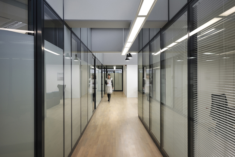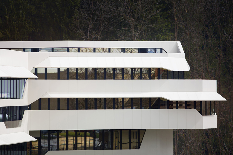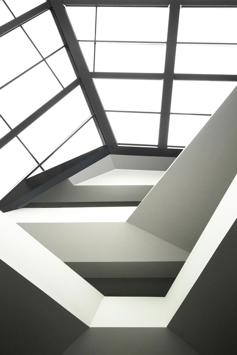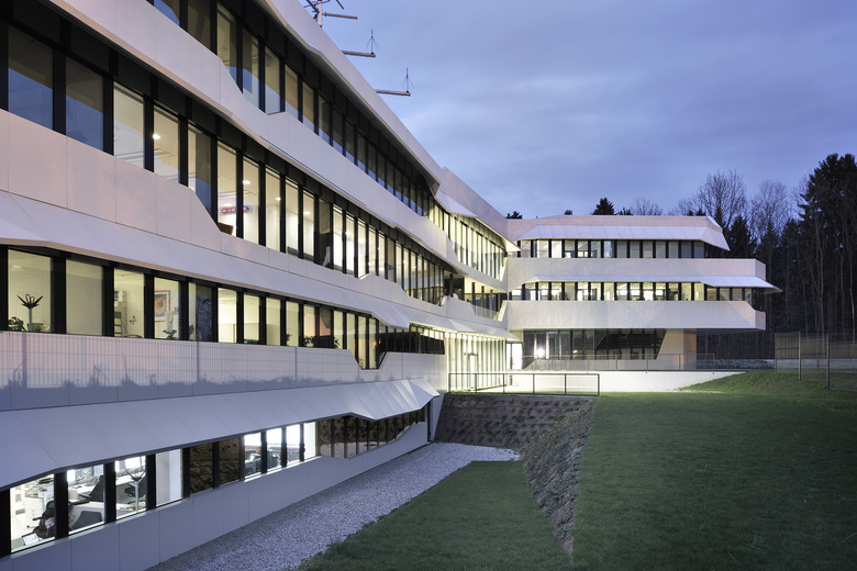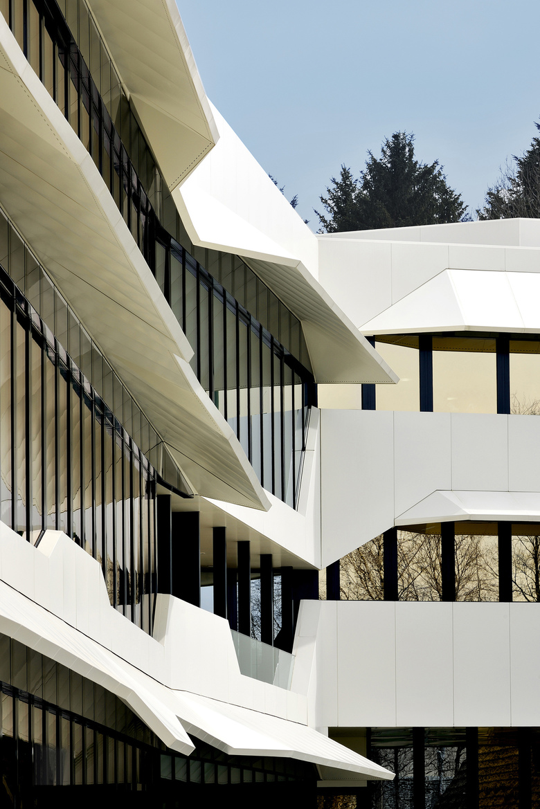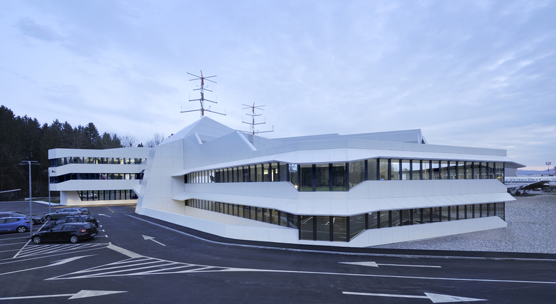 The whole building is wrapped in belts of glazing and combined aluminium parapets and brise-soleil that regulate the intensity of heat and light transmission to the interior. The windows are made of bronze reflective glass mirroring the mountains in the surrounding. The roof is designed with a flat roof system that rises in terraces, thus continuing the play of blinds and parapets on the facade. With its shape, the roof provides daylight to the interior areas, especially to the control room in the pentagonal 'head' of the object.