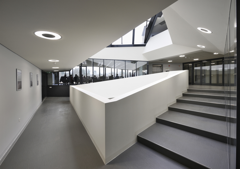 The compact design also serves to enhance the operational efficiency of the object. The paths are short and manageable. The clear division into a pentagonal head and two wings provides easy orientation within. The head and the wings are connected by a central area, the vertical hall. It is a multi-levelled area with an entrance lobby, canteen, conference room and gym. At the ground level in the wings there is a large conference room and two study rooms, while above them on two levels are the Centre's administrative areas. With correct orientation of the interior, suitable overheating protection and installation systems design for the use of renewable energy sources (geothermal energy), the compactness of the object also allows for a good energy performance certificate.