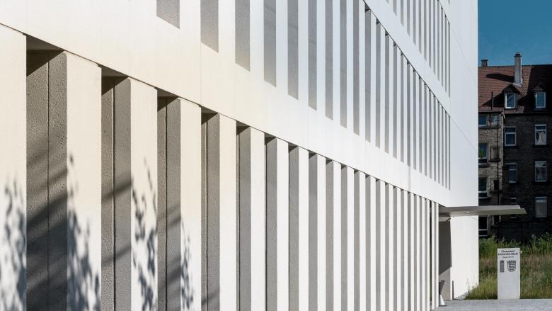 Ein auffälliges Fassadenraster in Sichtbeton prägt den kompakt und konstruktiv ausgebildeten Baukörper des neuen Finanzamts Karlsruhe. Die Umsetzung dieser besonderen Fassadenstruktur stellte die Planer vor eine große Herausforderung: Wie die stabile Bewehrung der weit auskragenden zweischaligen Betonfertigteile gewährleisten? Die Lösung zur tragfähigen und zugleich energieeffizienten Verbindung von Vorsatzschale und Tragschicht fanden die Baubeteiligten schließlich im Schöck Isolink. Der Fassadenanker besteht aus dem Glasfaserverbundwerkstoff Combar, ist dadurch extrem zugfest und verfügt über eine äußerst geringe Wärmeleitfähigkeit.