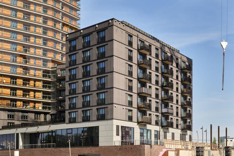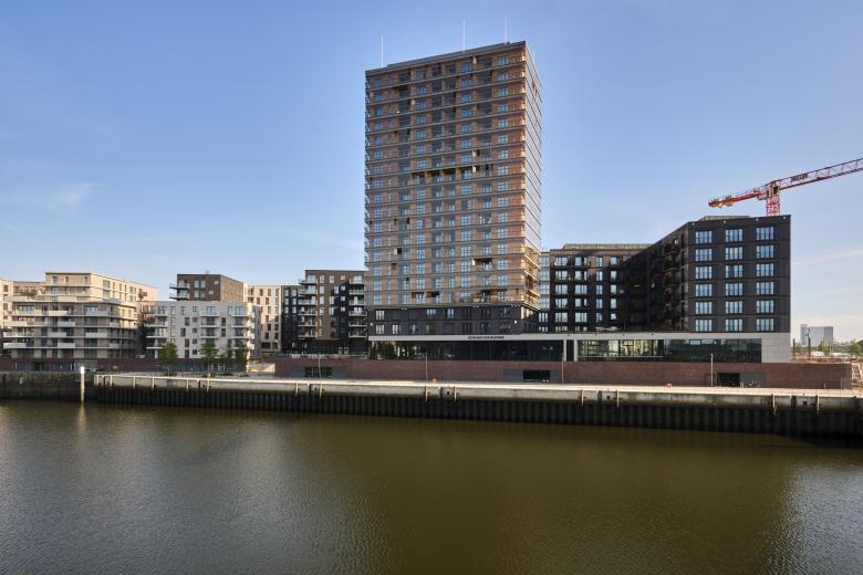 In der Hamburger HafenCity ist mit Roots das bislang höchste Holzhochhaus Deutschlands entstanden. Bauherrin ist die Garbe Immobilien-Projekte GmbH, der Entwurf stammt vom renommierten Hamburger Architekturbüro Störmer Murphy and Partners GbR. Die Planung des Hochhauses in Massivholzbauweise ist zukunftsweisend im Hinblick auf nachhaltige Projektentwicklung. Tragendes Material der Wohngeschosse ist Holz, einzelne Bauteile wie die Treppenhäuser und der Gebäudesockel sind aus Beton. Der Übergang von Stahlbeton zu Holz, wie bei dem ans Hochhaus angeschlossenen niedrigeren Gebäuderiegel, stellte die Planer vor manche Herausforderung. Die Lösung für den tragenden und thermisch trennenden Anschluss der Balkonplatten aus Stahlbeton an die Geschossdecken aus Brettsperrholz gelang den Planern in einer Sonderkonstruktion mit Schöck Isokorb T Typ S.