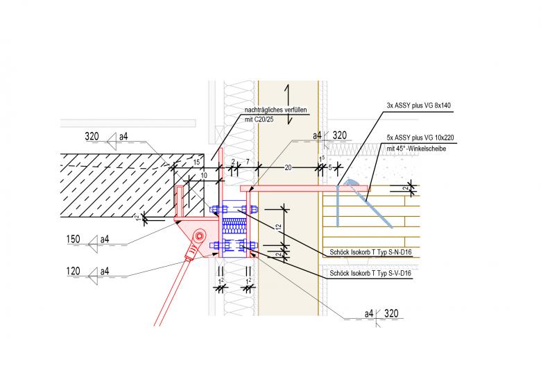 Die vertikale Lastabtragung übernimmt eine Stahlplatte. Sie liegt horizontal auf dem Stützenkopf auf und führt nach innen. Nach vorne schließt die Konstruktion mit einem Kopfblech ab, an das Schöck Isokorb bereits bei Rubner Holzbau montiert wurde. Die Stahlplatte wurde erst auf der Baustelle auf der Brettsperrholzdecke befestigt. Kopfblech und Isokorb liegen in der Dämmschicht vor der Stütze. Nach dem Ausdämmen und Abkleben wurde das äußere Stahlbauteil an das Wärmedämmelement montiert. Es ist als Konsole konstruiert, mit einem Auflager für die Balkonplatten und einem Dorn zur Lagefixierung. Die Stahlbetonfertigteile wurden einschließlich der passenden Öffnung ab Werk geliefert.