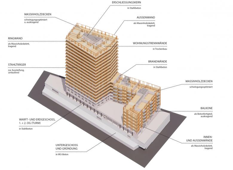 Für das gesamte Tragwerk ist Holz der vorherrschende Baustoff: Neben den Decken sind auch die Stützen innerhalb der tragenden Innen- und Außenwände aus Massivholz. Sie liegen im Wandquerschnitt der tragenden Außen- und Ringwände. Lediglich die Erschließungskerne, die Gründungssohle, die Sockelgeschosse und die ersten zwei Geschosse des Turms mit abschließender umlaufender Auskragung sowie die vorgehängten Balkone im Riegelbau sind als Stahlbetonkonstruktion geplant.