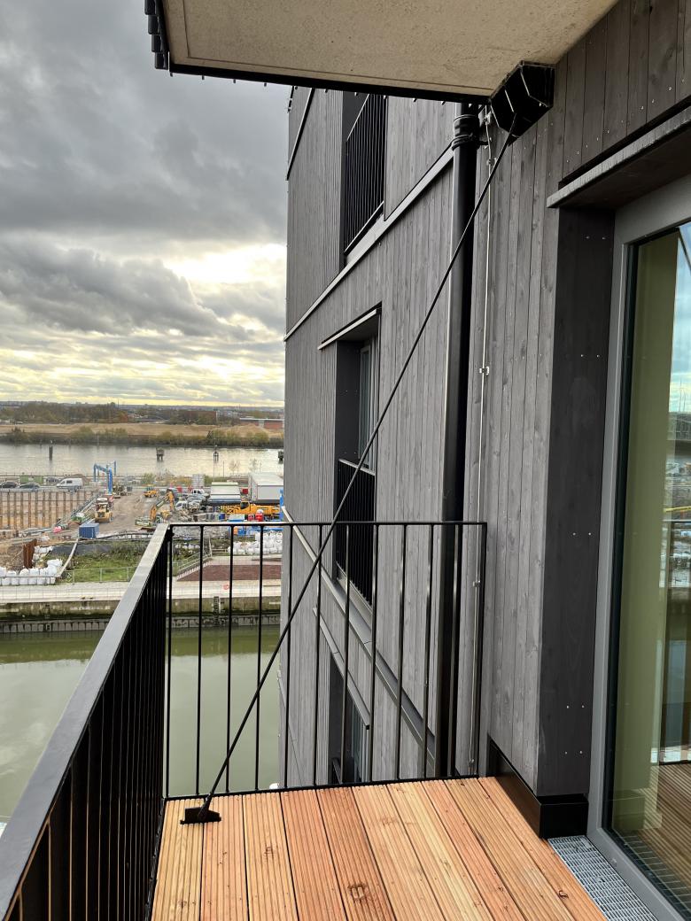 Bei der letzten Balkonreihe mussten die Zugstäbe an die bereits erstellte, oberste Geschossdecke aus Stahlbeton angeschlossen werden. Selbst für diese besondere Anforderung hat Schöck mit Isokorb RT ein passendes Produkt im Portfolio: Es ist das einzige tragende Wärmedämmelement am Markt, das einen nachträglichen Einbau in Stahlbetondecken ermöglicht. Zum Einsatz im „Roots“ für den Anschluss von Stahlkonstruktionen an Stahlbeton kam hierbei Isokorb RT Typ SK.