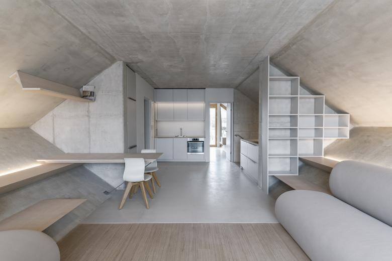 Die Wabe als Symbol für gemeinschaftliches Wohnen biete sich an, um Wohnlandschaften zu beleben und miteinander zu verweben. „Die Zeiten haben sich geändert und mit ihr unsere Art zu wohnen. Es geht nicht mehr darum, Bücherschränke aufzustellen, sondern optimale atmosphärische Wohnräume zu schaffen“, so Haimerl. Die Flächennutzung im Wabenhaus ist daher innovativ und fließend: jeder Raum ragt in einen anderen hinein, Wände verschwinden oder werden zu Verbindungstreppen und Raumtaschen. Senkrechte Wände oder ein klassisches Treppenhaus gibt es im Wabenhaus nicht – standardmäßig bildet eine Wabe eine Wohnung. Darüber hinaus gibt es größere Wohnungen, die über zwei Geschosse reichen. In diesen werden kleinere Wohneinheiten und eine Groß-WG realisiert. Im Erdgeschoss ist ein Quartiersladen für die Hausgemeinschaft und das Stadtviertel geplant, den die Bewohner betreiben und nutzen.