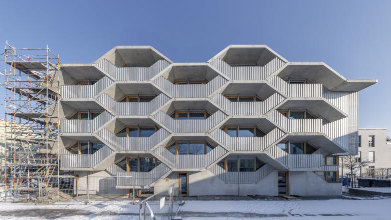 Vorgelagerte Fassaden in Wabenstruktur sind in der Architektur bekannt. Mit dem Wabenhaus im Münchner Stadtteil Riem allerdings geht Peter Haimerl Architektur einen Schritt weiter, genauer gesagt: ins Innere des Baukörpers. Der Architekt verlagert die Hexagonalstruktur nach innen und erklärt sie zum Bauprinzip: durchgesteckte Sechseckröhren, die zu einem großen Cluster gestapelt eine Art Bienenstock ergeben. Den zuverlässigen Anschluss der Fertigteilbalkone an die Waben sichert das tragende Wärmedämmelement Schöck Isokorb. Darüber hinaus trennt es die Bauteile thermisch, so dass Wärmebrücken auf ein Minimum reduziert werden – und ist damit ein essenzieller Baustein bei der Umsetzung des Gebäudes im Passivhausstandard.