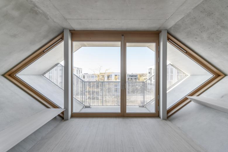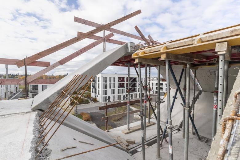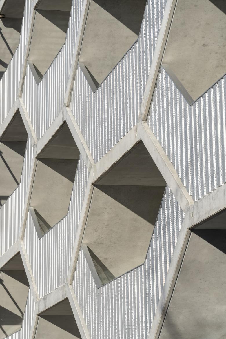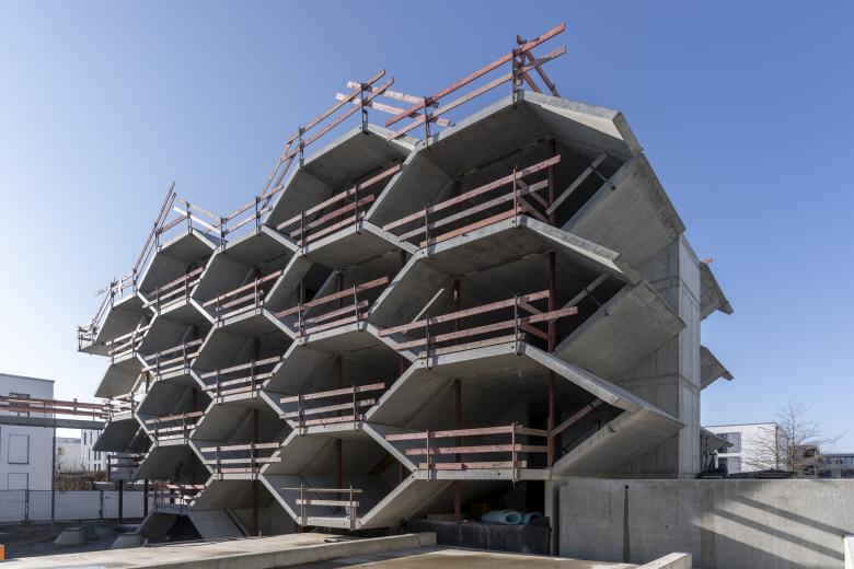 „Durch die Sechseckform ergibt sich eine Split-Level-Bauweise mit mehreren, auf halber Etagenhöhe zueinander versetzte Ebenen. Die Trennung der versetzten Halbgeschosse erfolgt dabei – sechseckbedingt – über schräge und nicht über senkrechte Wände“, erklärt Projektleiter und Geschäftsführer Thomas Beck vom verantwortlichen Planungsbüro a.k.a. ingenieure Beck Hintermann v. Kameke PartGmbB aus München. Die Waben bestehen aus horizontalen Ortbetondecken und schrägen Halbfertigteilen. Der Vielfalt und Variabilität sind dabei fast keine Grenzen gesetzt. Die Umsetzung des Wabenhauses erfolgte in konventioneller Massivbauweise. Eine spezielle Konstruktion erforderte lediglich der Anschluss der Balkone, über die jede Wabe nach West und Ost verfügt.