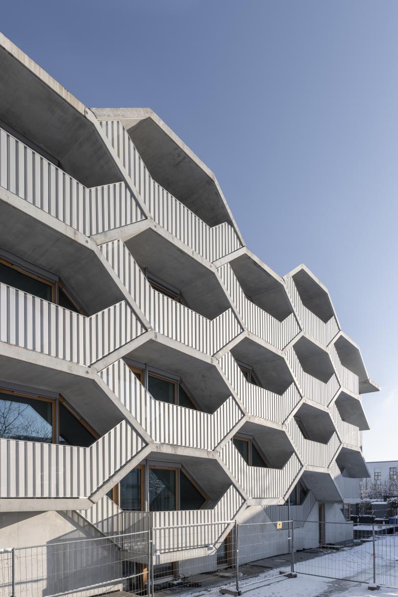 Für das Baufeld in der Münchner Den-Haag-Straße hatte sich die Bauherrin Wogeno München eG einen städtebaulich und architektonisch besonderen Beitrag vorgenommen: An diesem Ort sollte ein experimenteller Wohnbau entstehen, der einen Kontrast zu den gleichförmigen Bestandsbauten des Viertels setzt. Der moderne, wie provokante Entwurf des vielfach ausgezeichneten Architekten Peter Haimerl interpretiert das auf ungewohnte Weise und bricht dabei radikal mit der quaderförmigen, standardisierten Gebäudestruktur – dem „Schachtelbau“, wie er es nennt: „Wir wollten bewusst andere Wohn- und Raumkonfigurationen anbieten. Die in der Natur weit verbreitete Hexagonalstruktur erlaubt vielfältige Kombinationsmöglichkeiten von Raumeinheiten, Clustern und räumlichen Verflechtungen“.