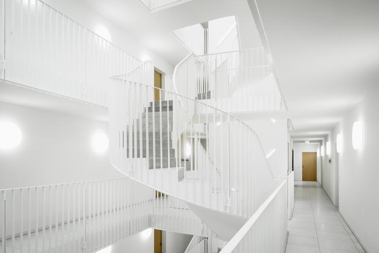 Jedes der sechs Gebäude wird über ein großzügiges, von oben natürlich belichtetes Atrium mit einer offenen, halbgewendelten Treppe erschlossen. Von den Außenwänden dieses Lichtraums spannen leicht schräg angeordnete Stege, die über eine umlaufende Galerie erreichbar sind und von denen sich die Stahlbetontreppe nach oben und unten schwingt. Durch die exponierte Lage und die wenigen vertikalen Auflagern der Treppe war es eine große Herausforderung, die statisch erforderliche Bewehrung zu erreichen. Hinzu kam die Anforderung, die Treppe vom restlichen Gebäude akustisch zu entkoppeln. Um dies zu gewährleisten, nutzten die Planer das Trittschalldämmelement Schöck Tronsole. Normalerweise erfolgt die Schallentkopplung sowie die Lastabtragung über Auflager an Decken und Podesten. Da die Treppe hier allerdings frei im Raum hängt, wurde die Schöck Tronsole ausschließlich am Antritt des Treppenlaufs im Erdgeschoss sowie an den Auflagerpunkten der Stege eingebaut. Damit wurden der Treppenfuß und die Stege akustisch vom Gebäude entkoppelt, was bei einem fachgerechten Einbau die Gefahr von Schallbrücken verhindert. Die Konstruktion erschließt die Galerien des Atriums über sechs Geschosse hinweg. Um das dafür notwendige zusammenhängende Tragwerk zu gewährleisten, wurden die Stege in Ortbeton gefertigt und die halbgewendeten Treppenläufe als Stahlbetonfertigteile geliefert. Mit einer speziellen eingeschraubten Anschlussbewehrung wurden die Treppenteile mit der Armierung der Stege verbunden, die alle mit der Sonder-Tronsole Typ B linienförmig entkoppelt wurden. Um sowohl abhebende als auch horizontale Lasten abfangen zu können, wurde auch seitlich, oben und stirnseitig der Stege die Tronsole Typ B vorgesehen.