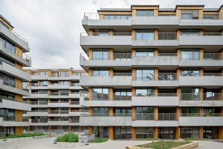 Gestaltete Aufenthaltsbereiche und Kinderspielflächen zwischen den Häusern sorgen für eine Offenheit, die eine einladende und verbindende Alternative zu dichten Gründerzeitvierteln, zum klassischen Baulückenschluss und zum geschlossenen Berliner Blockrand darstellt. Hinzu kommen die „vertikalen Gärten“ auf den umlaufenden Terrassen und Dachflächen mit insgesamt rund 2.400 großen begrünten Pflanzkästen, die dem Wohnensemble nicht nur eine ganz besondere Atmosphäre und Qualität verleihen, sondern auch für ein verbessertes Mikroklima in den Wohnungen und auf den Balkonen sorgen. Die dahinter liegende offene, mit Vor- und Rücksprüngen gegliederte Holzfassade aus Thermokiefer ermöglicht maximalen Lichteinfall. Durch die Rücksprünge entstehen großzügige Loggien, die ein hohes Maß an Privatsphäre für die einzelnen Wohneinheiten schaffen.