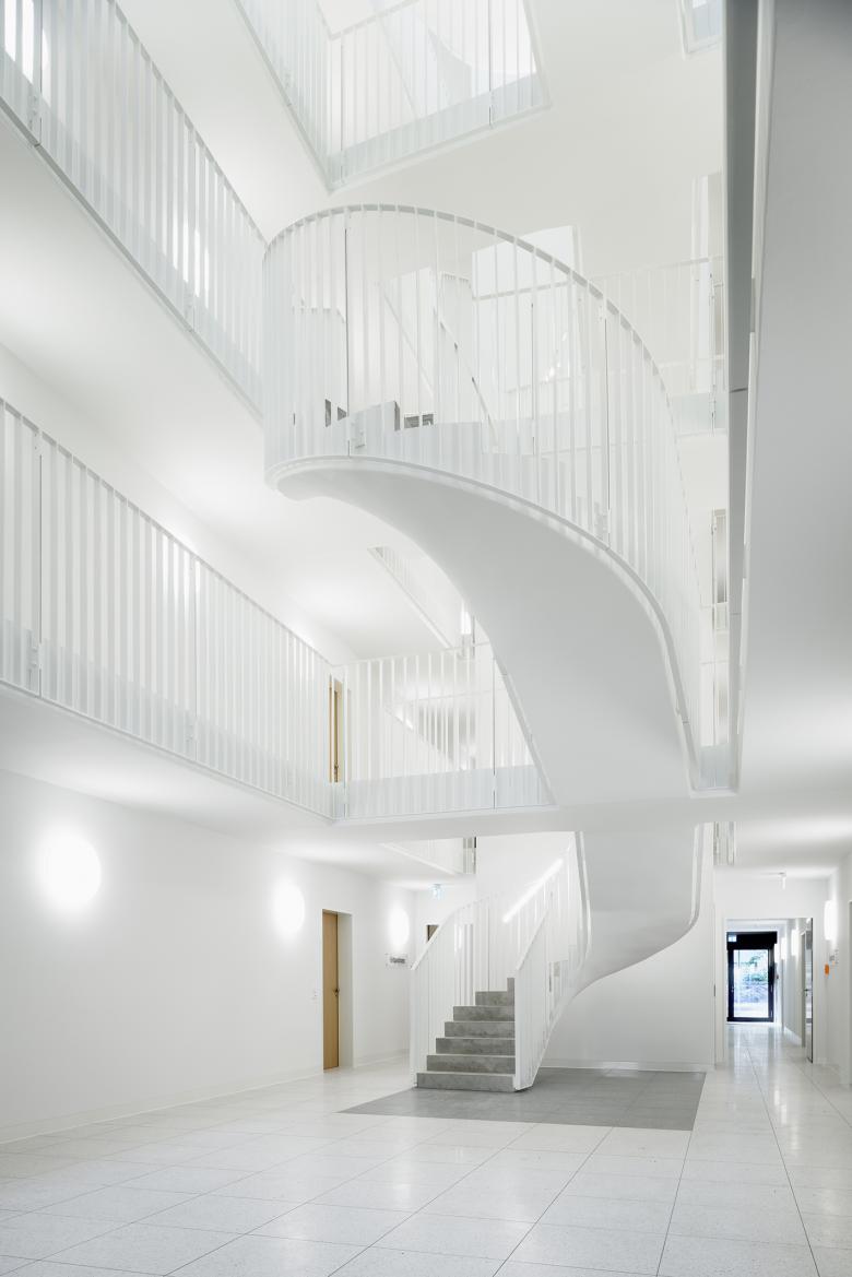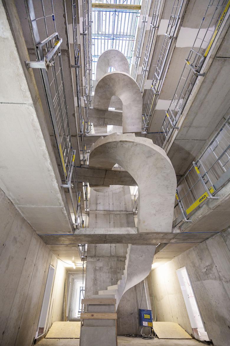 Blickfang im Atrium: die offene, halbgewendelte Stahlbetontreppe