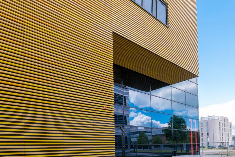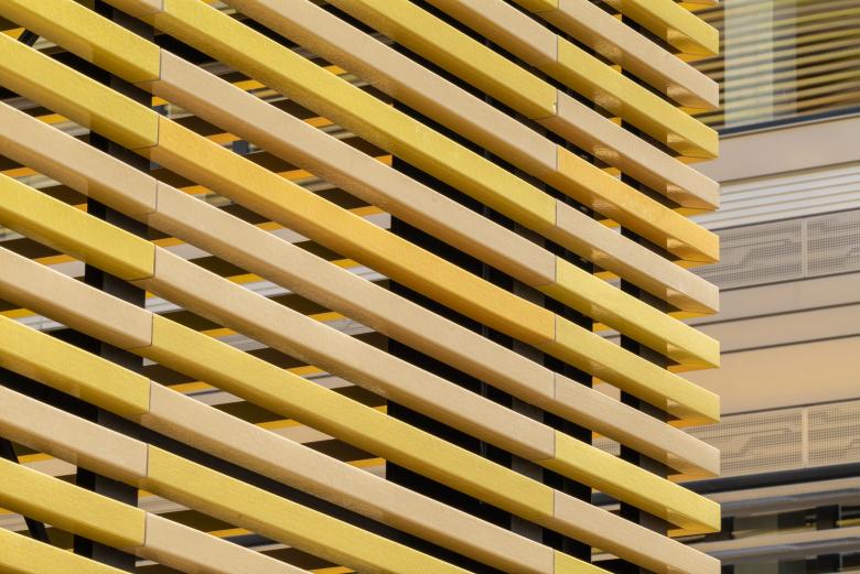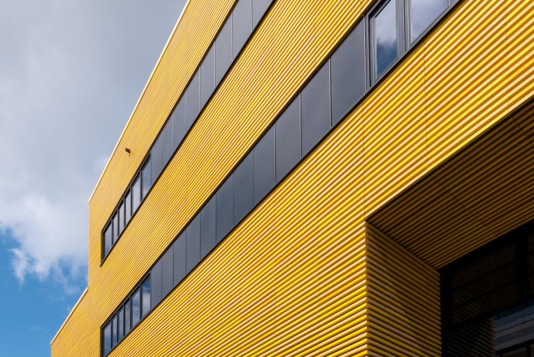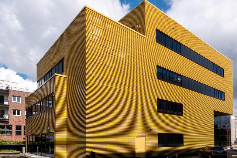 Die Fassade glänzt durch verschiedene gelbe Farbnuancen und -abstufungen, durch die ein dynamisches und zugleich edles Farbspiel entsteht. Die Umsetzung der Fassadenbekleidung mit glasierten Keramikstäben, sogenannten Baguettes, in fünf Gelbtönen (RAL 1002, 1004, 1012, 1018 und 1021) greift dabei in seiner Horizontalität die Formensprache des Campus auf und orientiert sich in puncto Material an den Bestandsgebäuden.