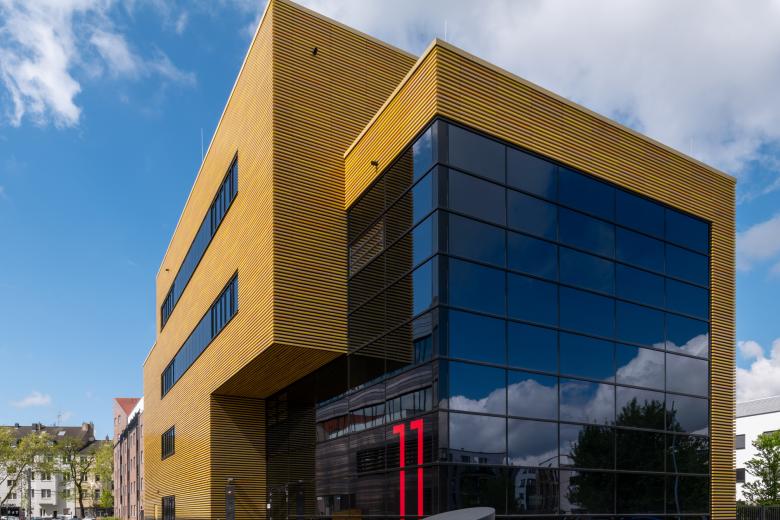 Auf dem Campus der Hochschule Düsseldorf hat RKW Architektur + aus Düsseldorf, eines der renommiertesten deutschen Architekturbüros, das Zentrum für Digitalisierung und Digitalität, kurz ZDD, gebaut. Mit einer Fassade aus glasierten Keramikbaguettes in verschiedenen Gelbtönen fügt sich der markante Kubus konsequent und harmonisch in die bestehende Umgebung mit den markanten Aluminiumfassaden der Campus-Neubauten und den historischen Ziegelbauten ein. Die sichere und wärmebrückenfreie Befestigung der vorgehängten hinterlüfteten Fassade (VHF) ermöglicht Schöck Isolink Typ F. Darüber hinaus konnte damit auch die Dämmstärke reduziert werden – das verschaffte den Architekten zusätzlichen Raumgewinn im Inneren.